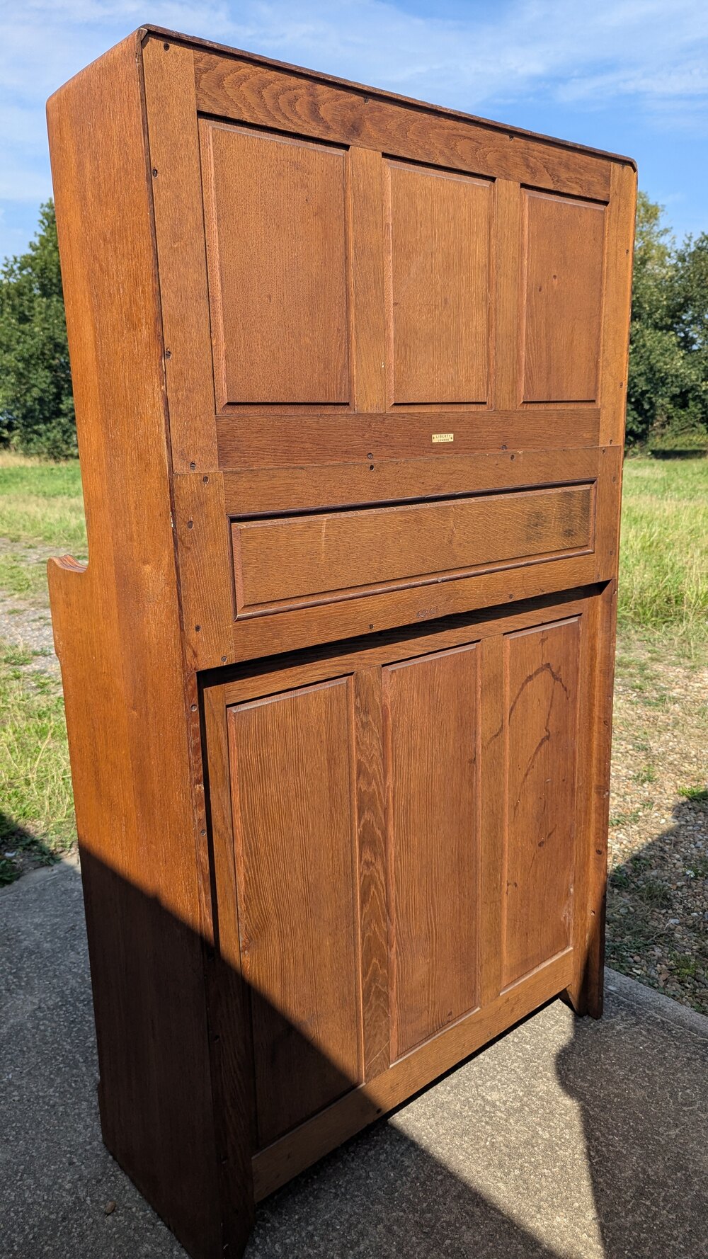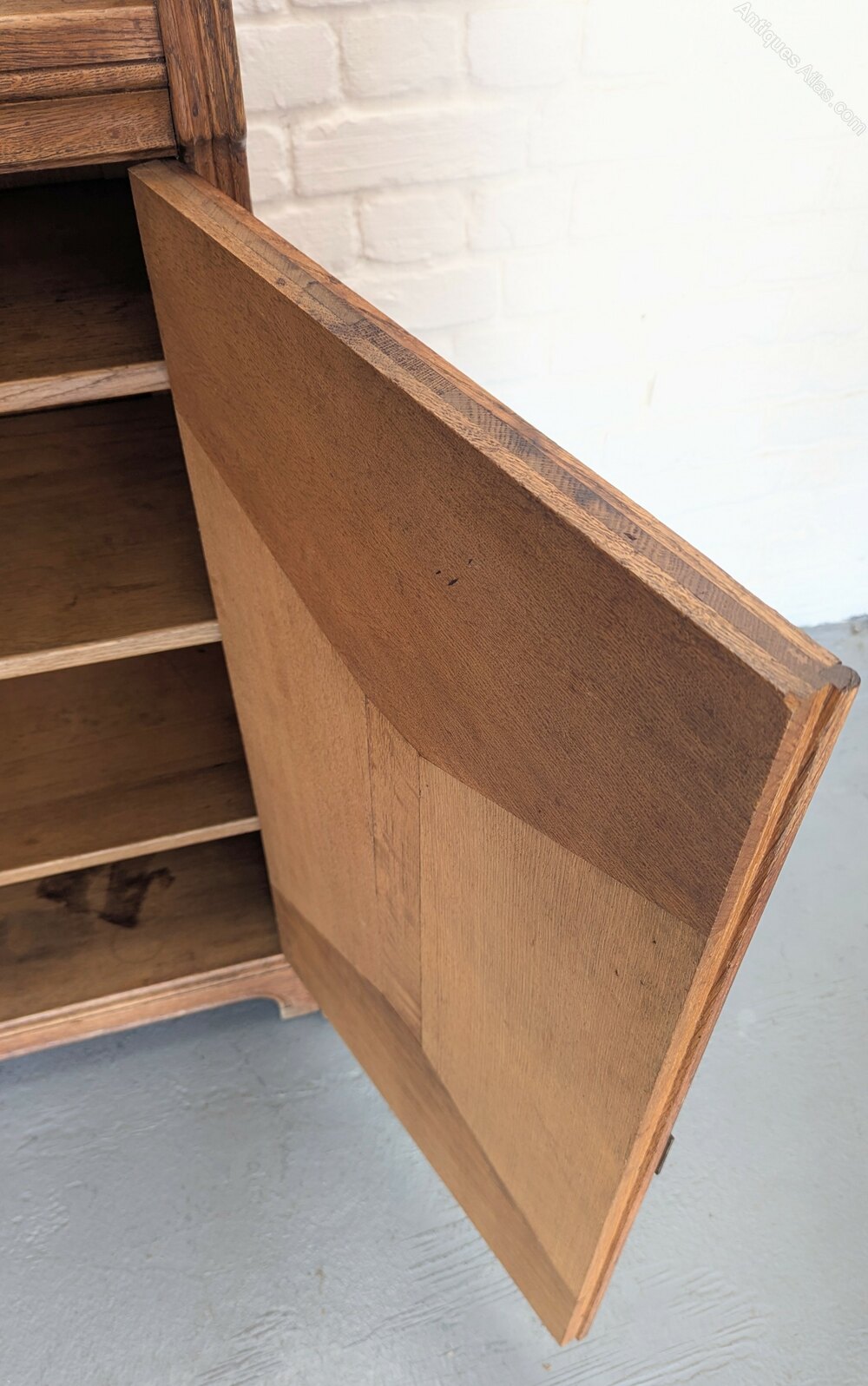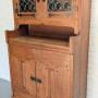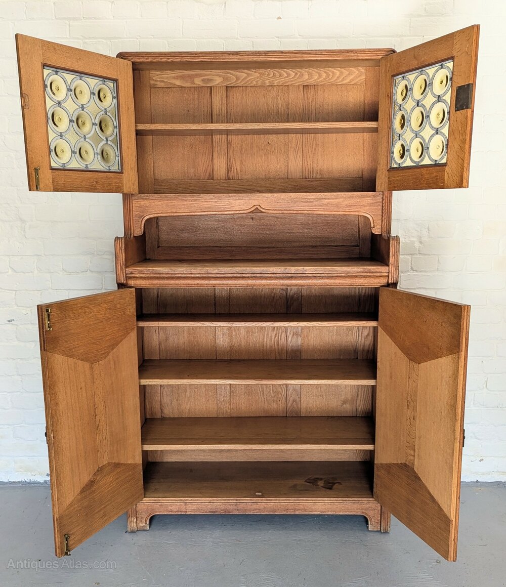 A beautifully constructed Liberty oak dresser with steel hinges and lock and leaded bottle glass upper doors in used condition measuring 196 cm x 46 x 88. Labeled on the back.