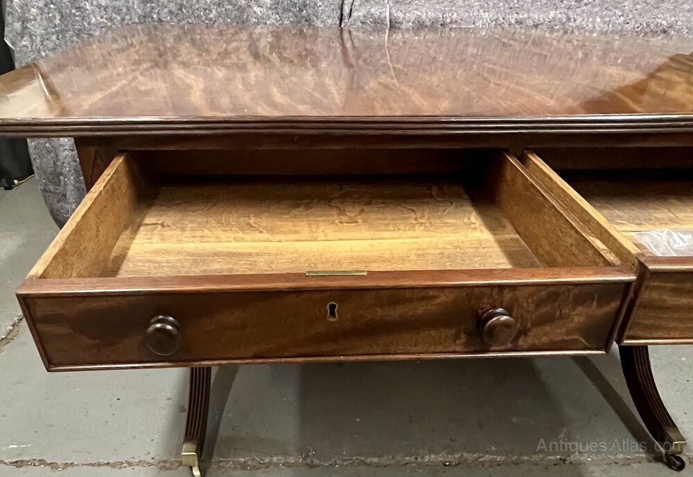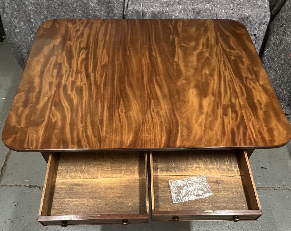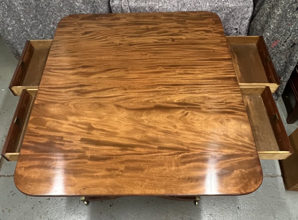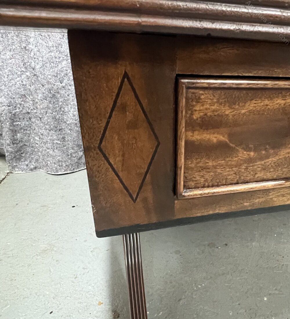 A superb Regency Style 19th. Century partners library table or partners desk. The beautifully figured mahogany top having a reeded edge and rounded corners. Below are 2 drawers to each side with turned pulls, brass escutcheons and cockbeading complete with working brass locks & keys. The stiles having diamond shaped ebony inlay and the whole supported on out swept sabre legs with reeded detail and terminating in brass square cup casters. Condition- Very good with excellent colour and oak linings. Dimensions:- Height… Width… Depth… Delivery to most of U.K. mainland £85.