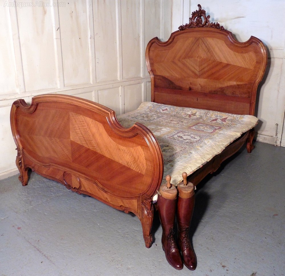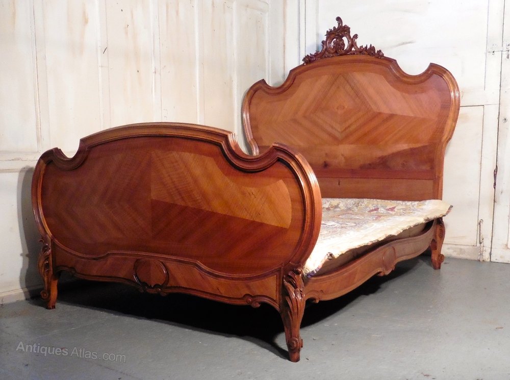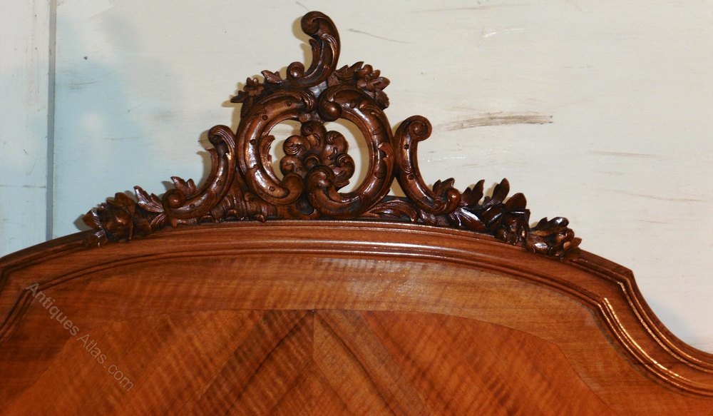 The bed is made in quarter veneered walnut and has a superbly carved crest on the headboard, the carved decoration is repeated on the feet and it comes with a new purpose box base