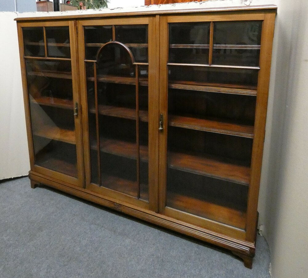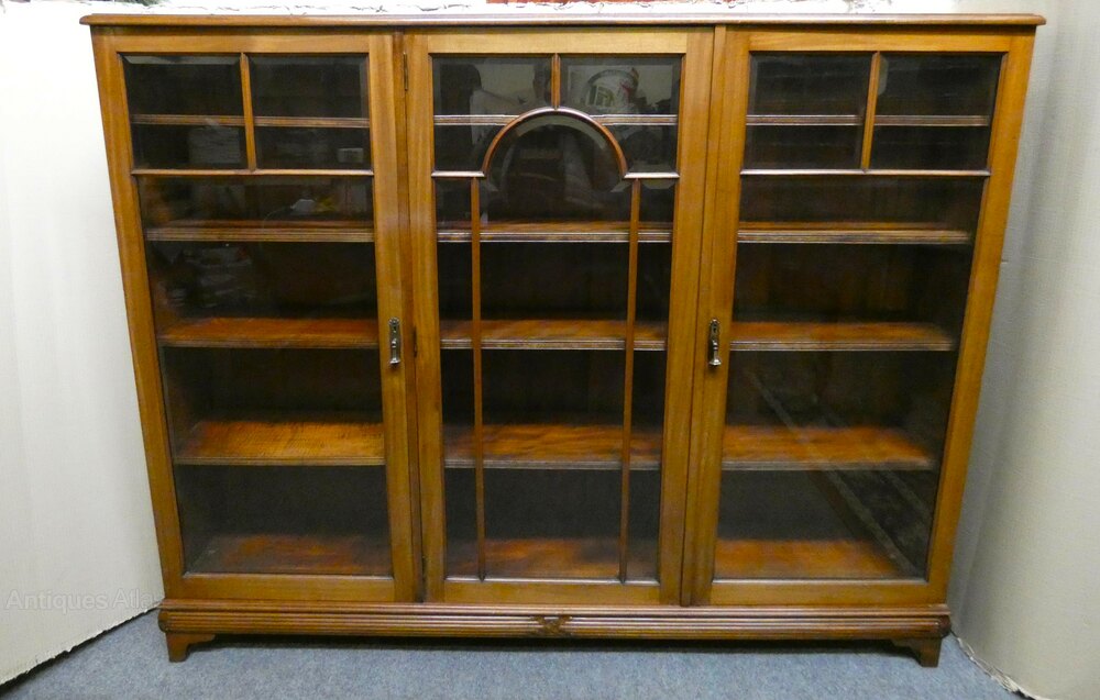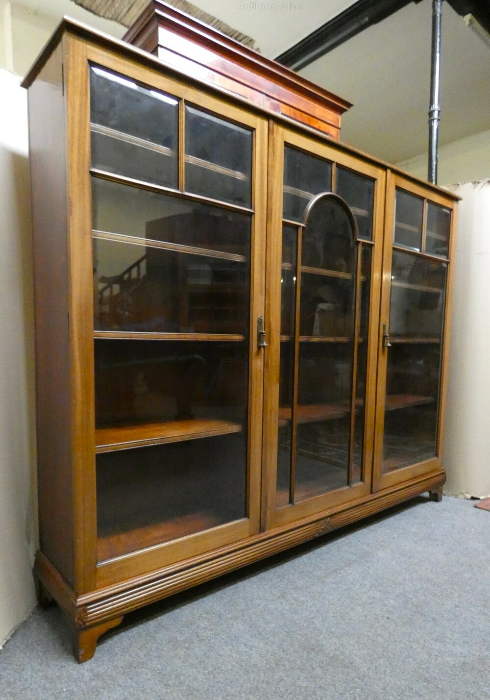 The three doors ( working locks and keys ) all with bevel edged glass, open to interiors fitted with adjustable shelves, the plinth base has attractive carved details, raised on bracket feet.