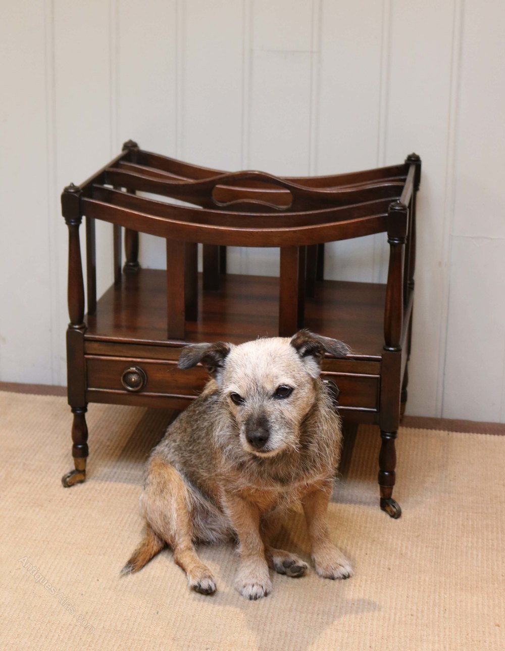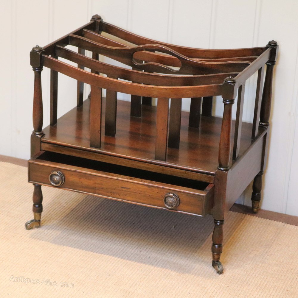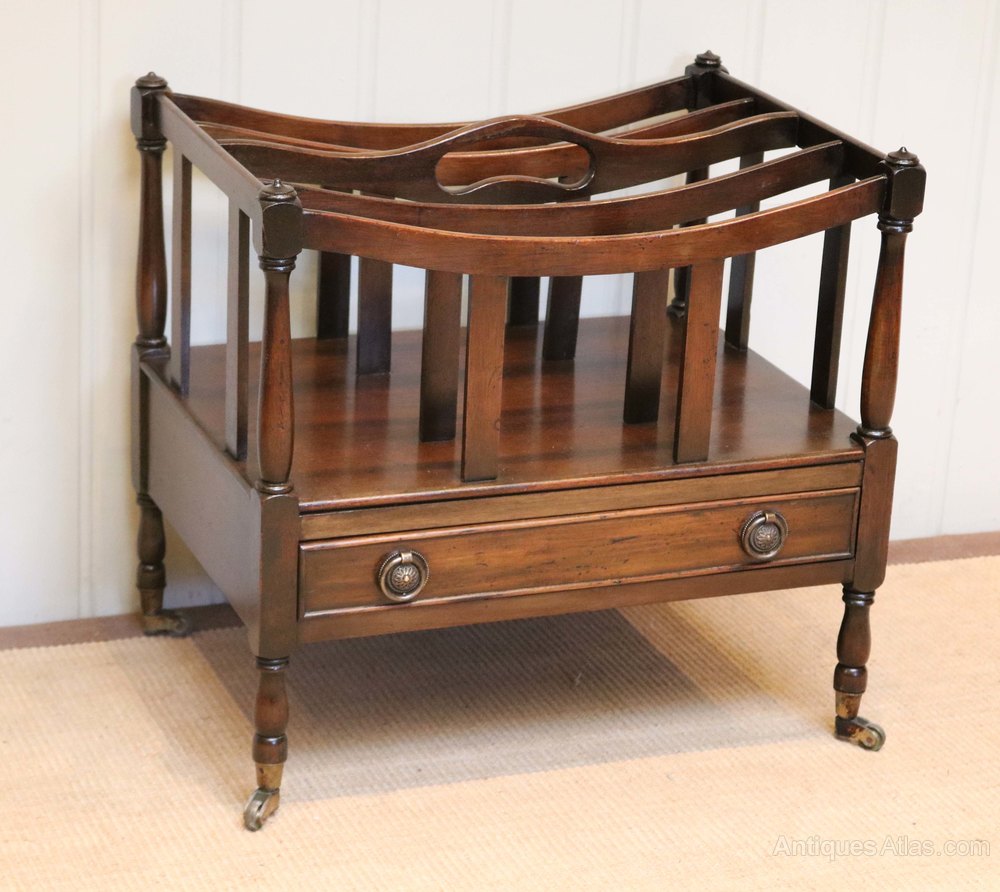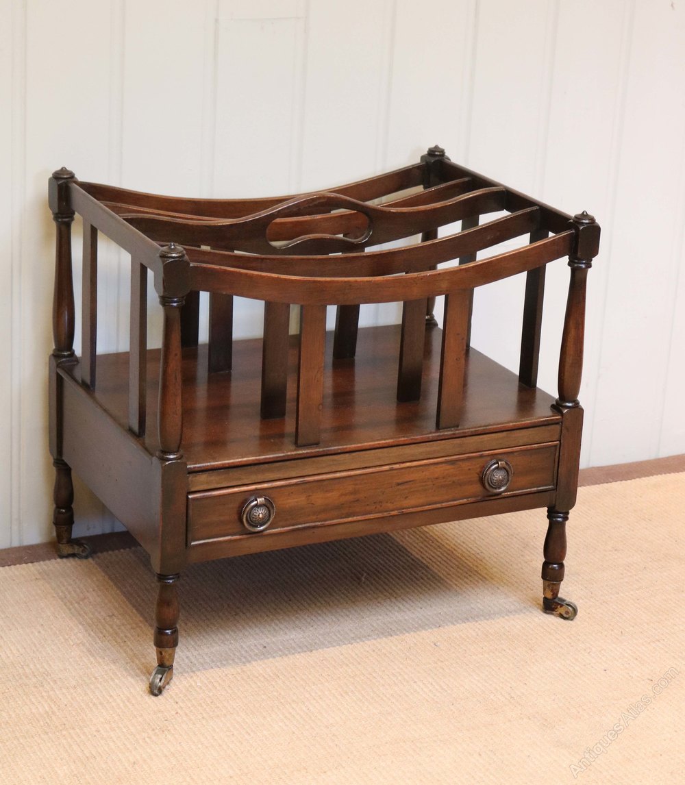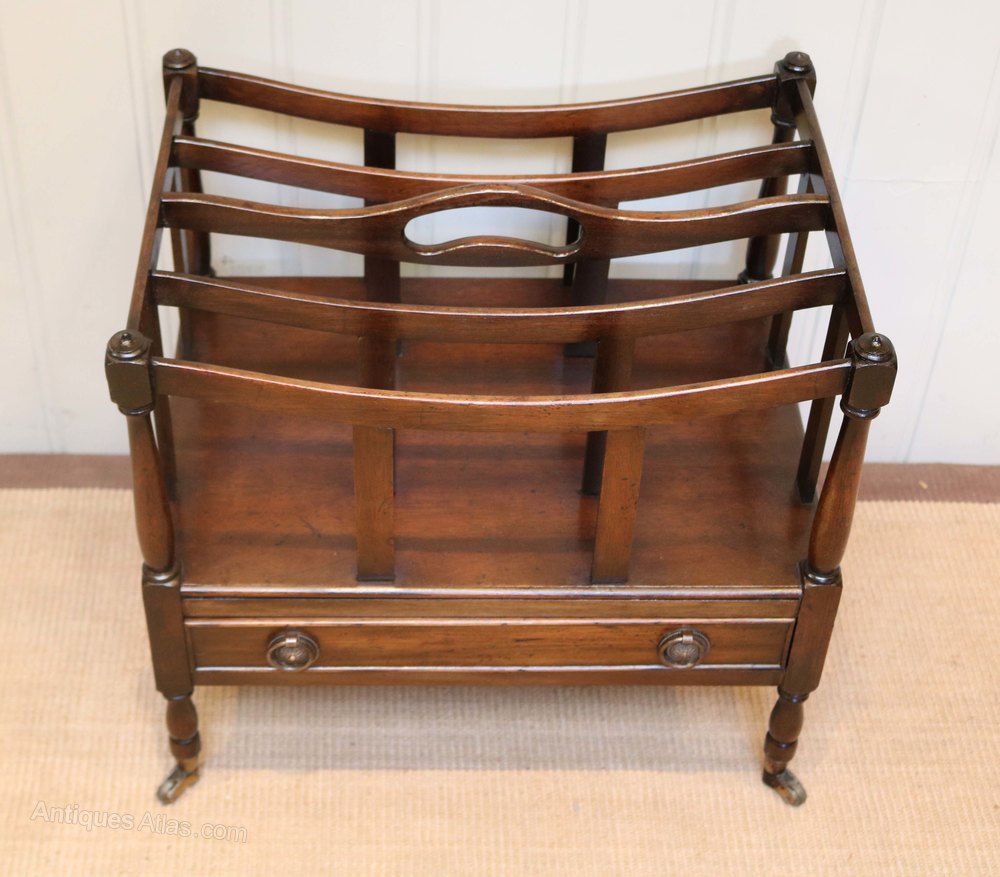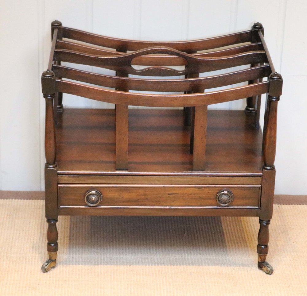 Mahogany canterbury having four slatted divisions and a pierced carrying handle between turned supports above a single drawer raised on turned legs with brass cap castors