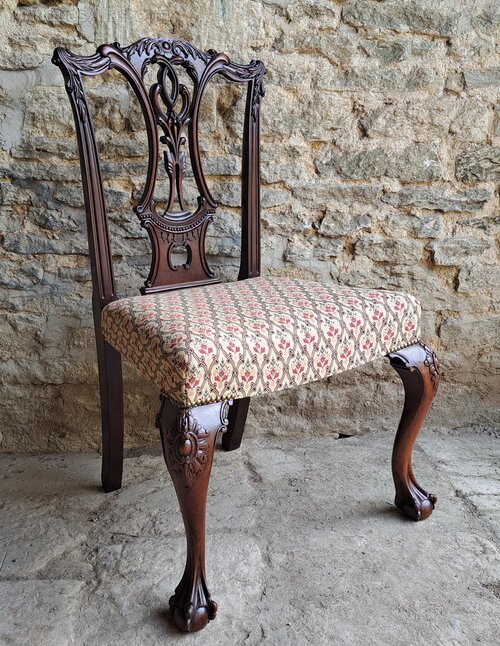 A beautiful mahogany Chippendale style dining chair. Dating to the mid 19th century, this chair is of the utmost quality with superb carving to the back and knees. With elegant cabriole legs on ball and claw feet this chair would look stunning in any room of the house.
