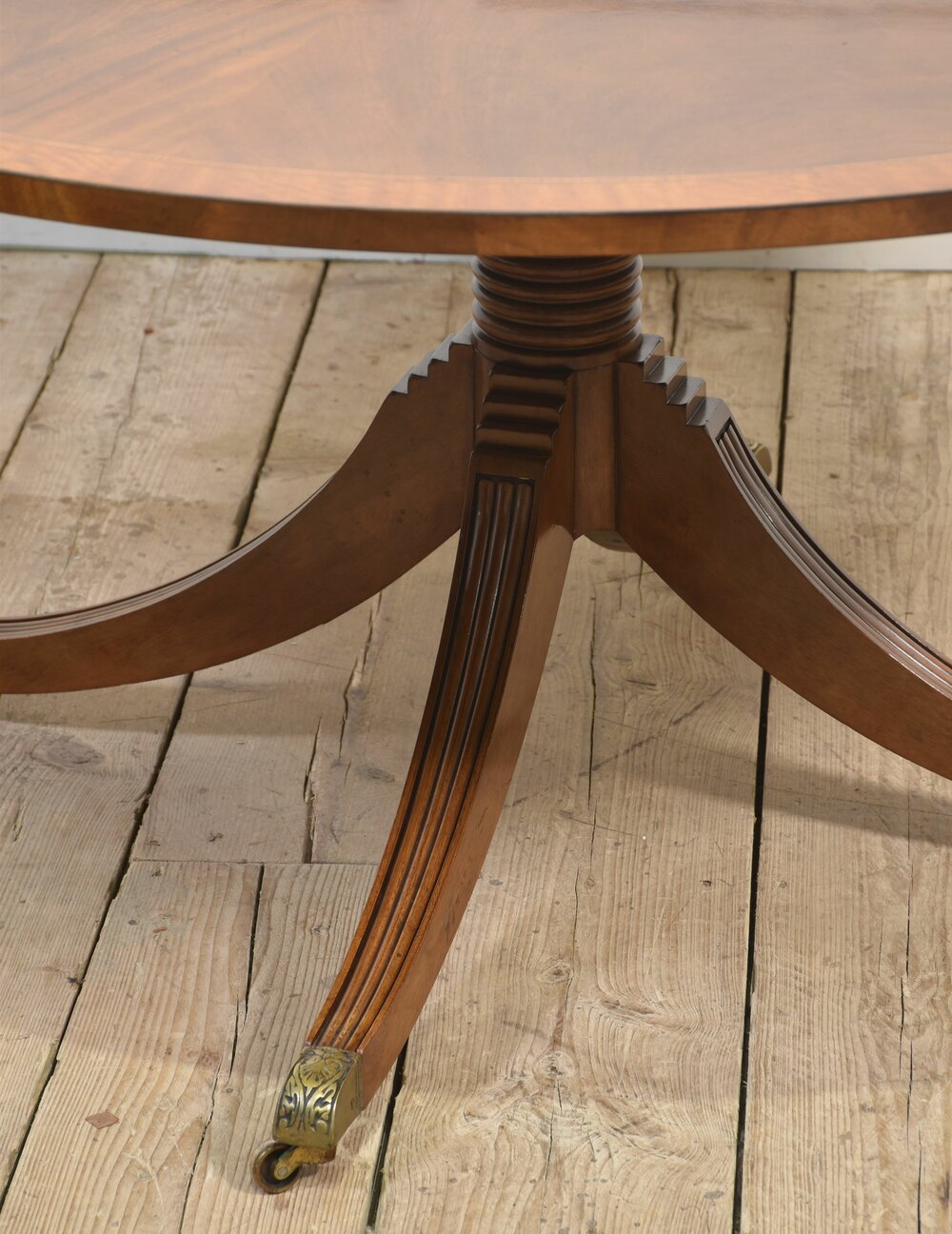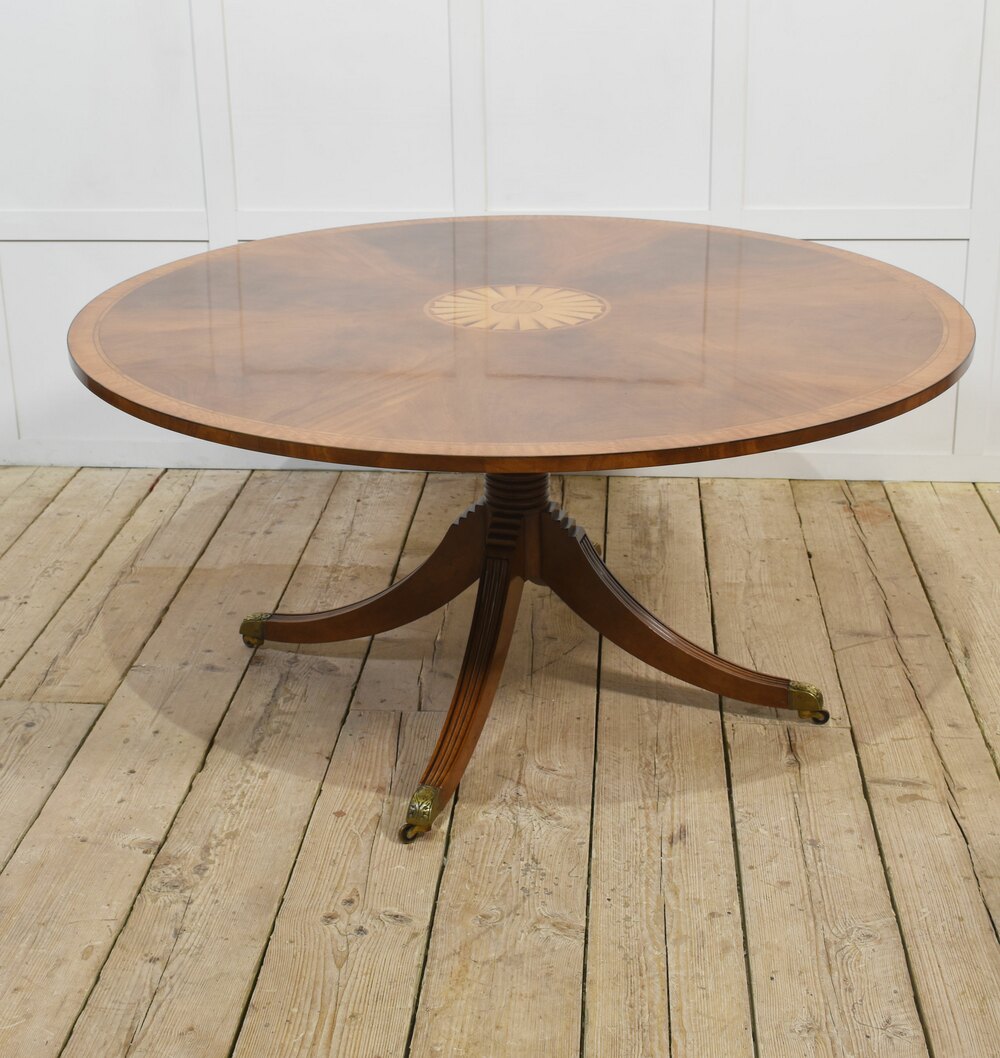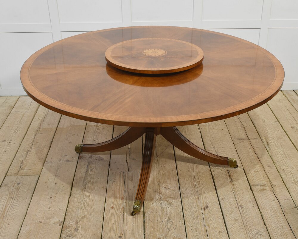 Mahogany circular dining table with a well-figured top and central inlay surrounded by cross-banded edge. Raised on a turned column with splayed supports terminating in brass caps and castors. The table will seat 6-8 People and can be dismantled for easy transportation. Together with matching lazy suzann.