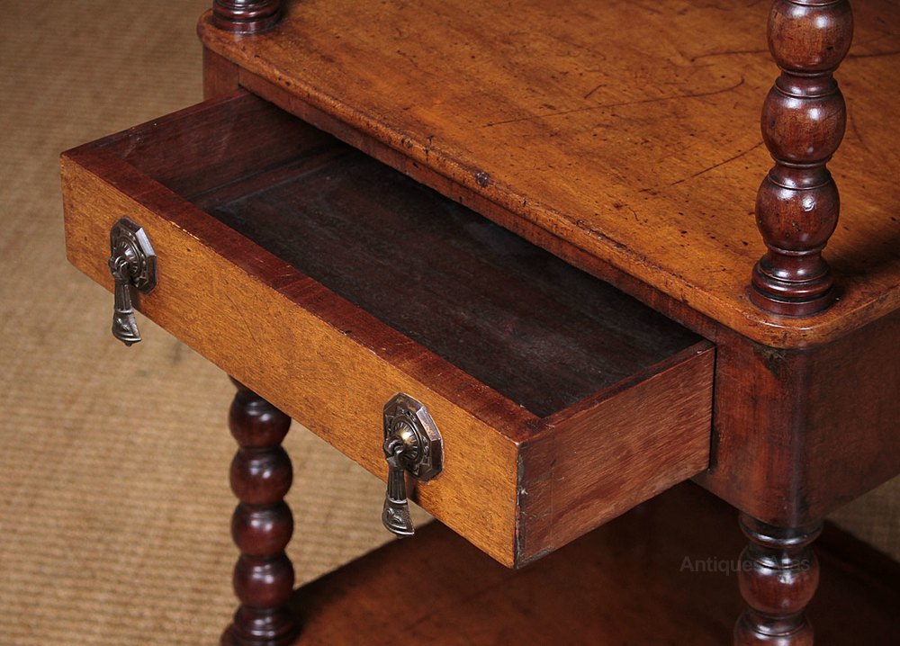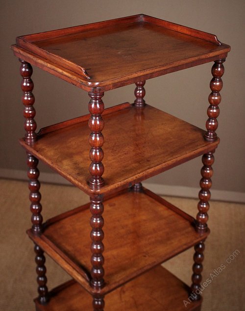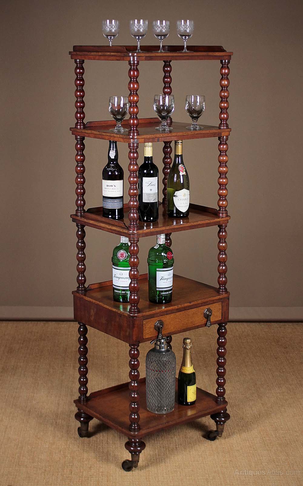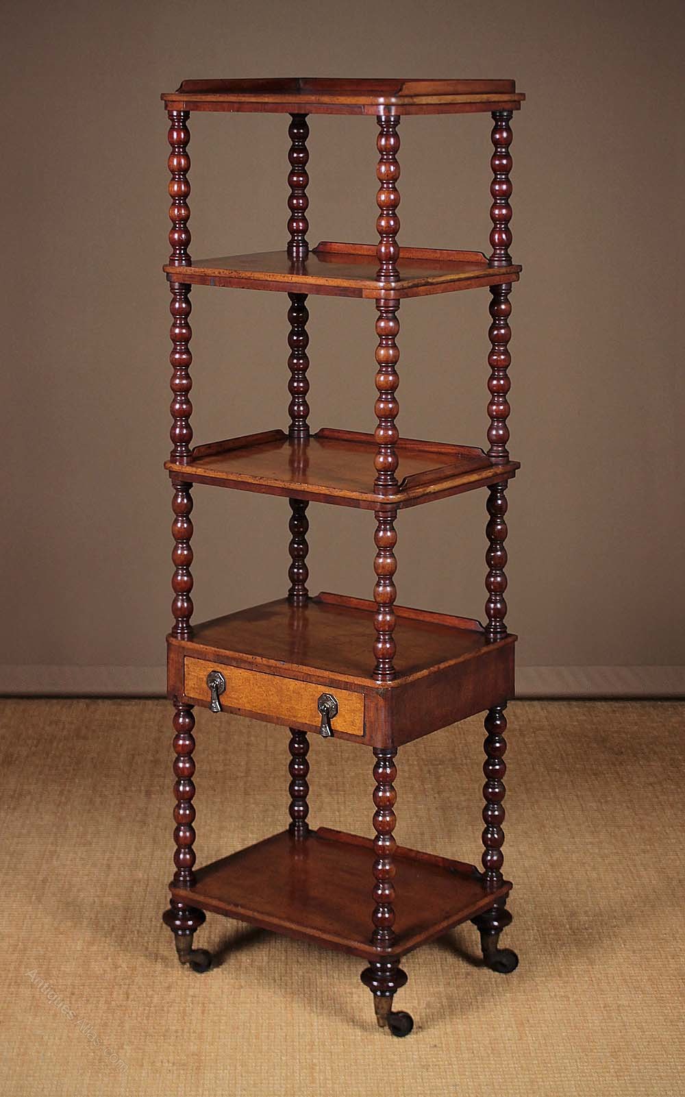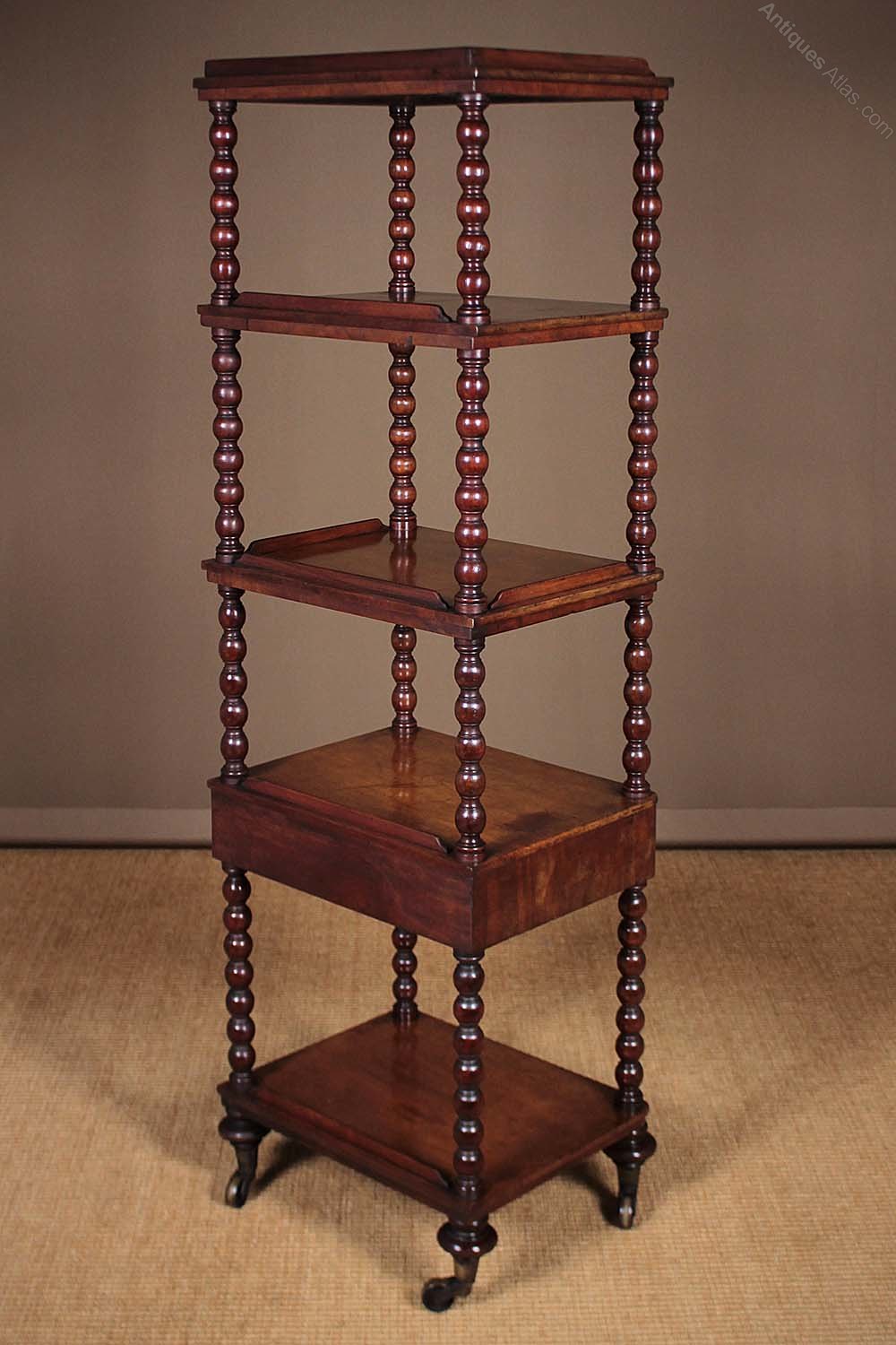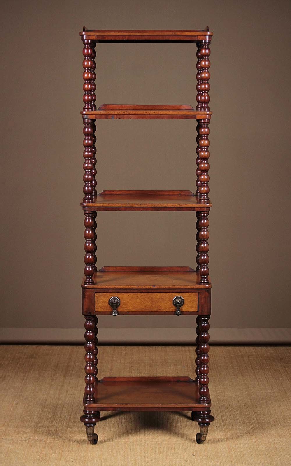 Mid 19th.c. mahogany stand c.1840. Taller than many we see, with five shelves plus a single drawer. Just 19″ wide ideal for drinks, as a bookshelf, or in a bathroom perhaps to store towels etc. Solid mahogany shelves with raised galleries, on lovely bobbin turned columns front and rear. Turned feet retaining the original large brass cup castors. Mahogany drawer linings. Excellent colour and condition, with later drop handles to the drawer. Cleaned and waxed in our workshops.