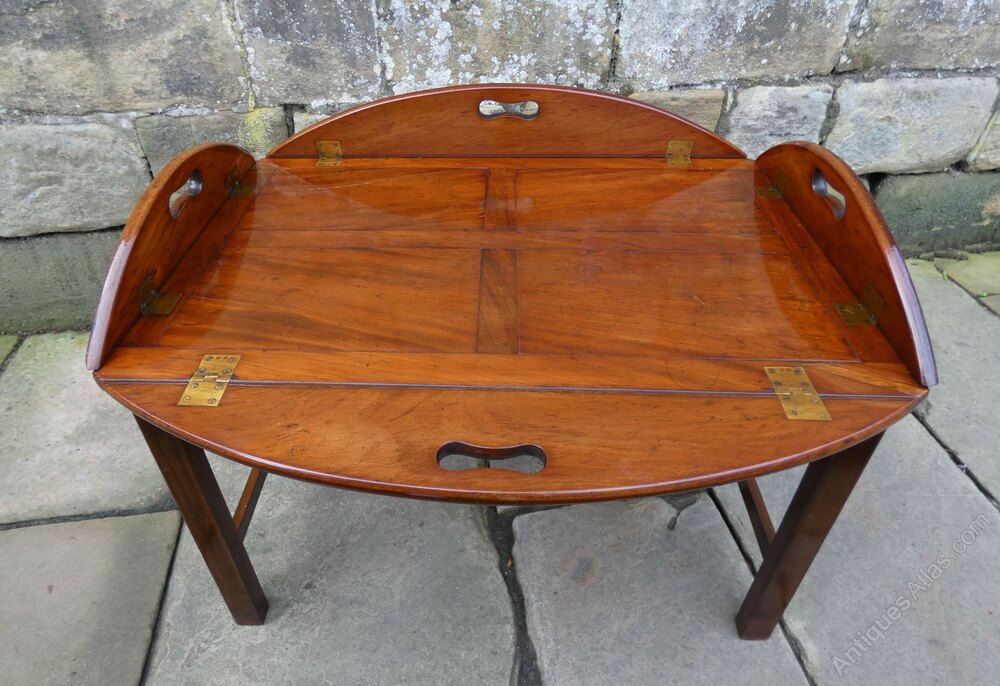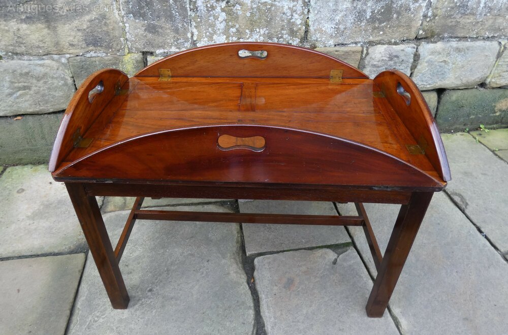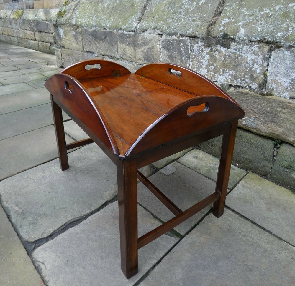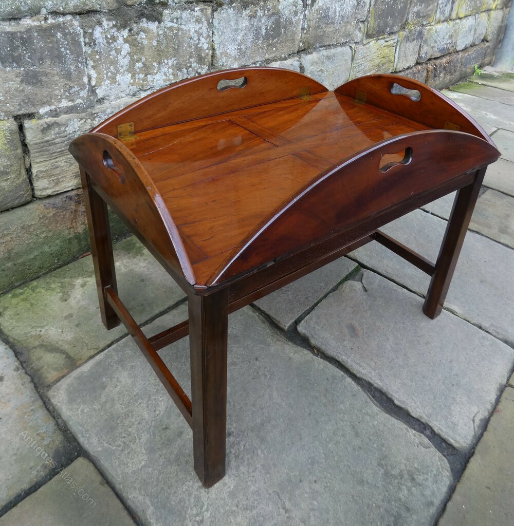 The panelled tray with folding sides and inset brass hinges sits on a rectangular stand.
