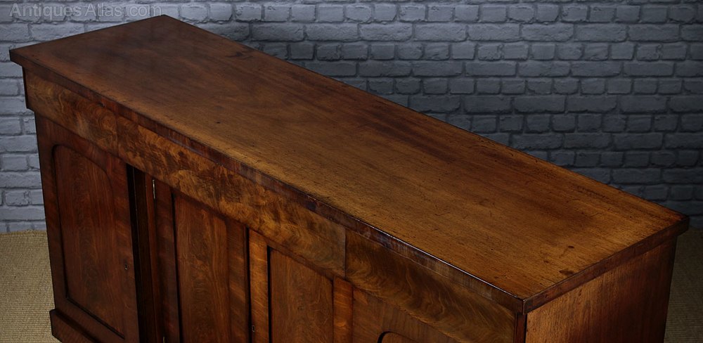 Splendid mid 19th.c. mahogany chiffonier sideboard c.1860. Single piece solid mahogany top with crossbanded edge over three drawers and an inverted breakfront four door cupboard base. Fitted with sliding shelves and the original bottle drawer. Symmetrically arranged flame mahogany veneers across the drawer fronts, doors and plinth. Solid mahogany sides and drawer sides. Good mellow colour, excellent condition, cleaned and polished in our workshops. Key supplied.