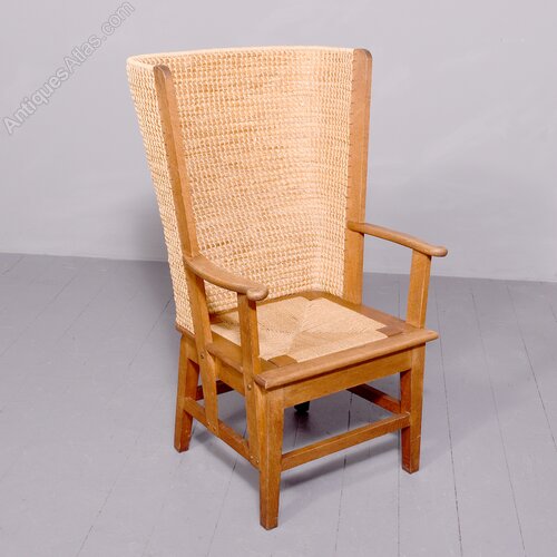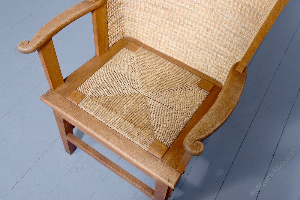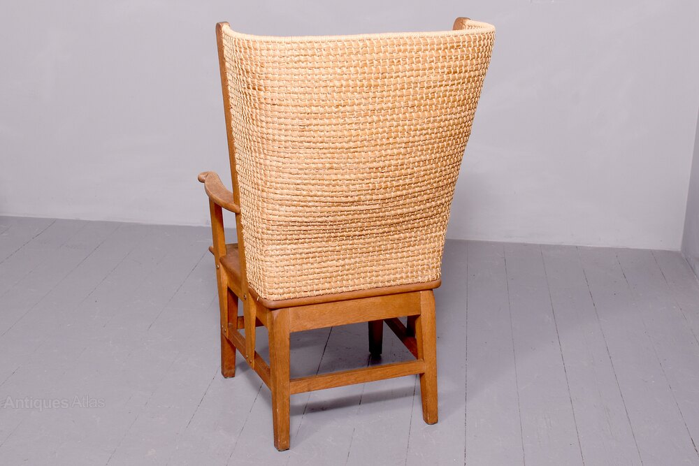 Circa 1960. Rare, outsized mahogany framed Orkney chair in perfect condition. Handmade in Orkney with classically woven oaten straw and marram grass bindings, with a lift out rattan seat. The arms with the classic Kirkness scrolled ends all on square supports with stretchers.
