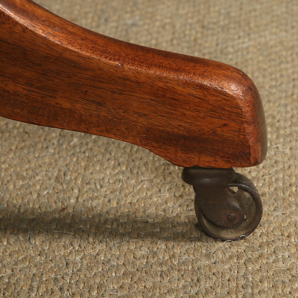 The mahogany leather desk chair incorporates the original mechanism allowing it to rotate 360 degrees and recline backwards. The seat height can be adjusted by turning a “bell shaped” metal nut on the underside of the chair, while the reclining tension can be adjusted by turning the small wheel at the front of the mechanism. The desk chair mechanism is in excellent working order, having been stripped down, cleaned and service.