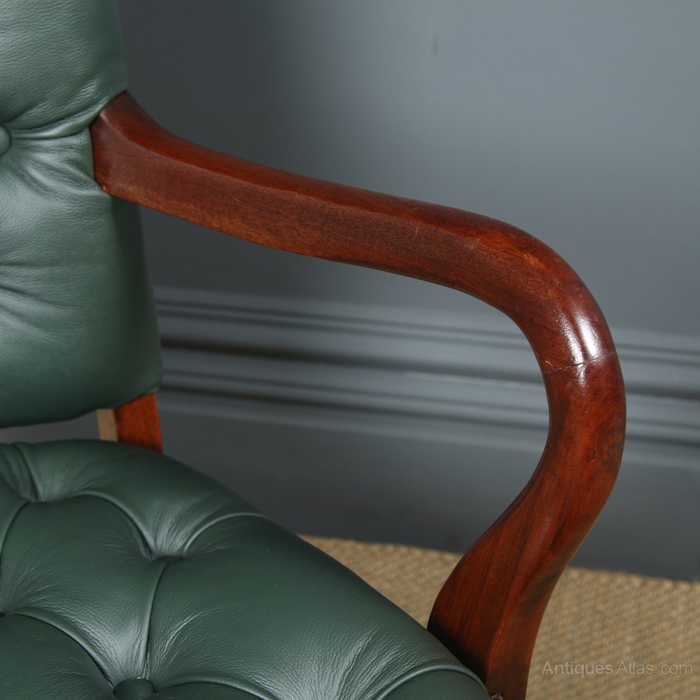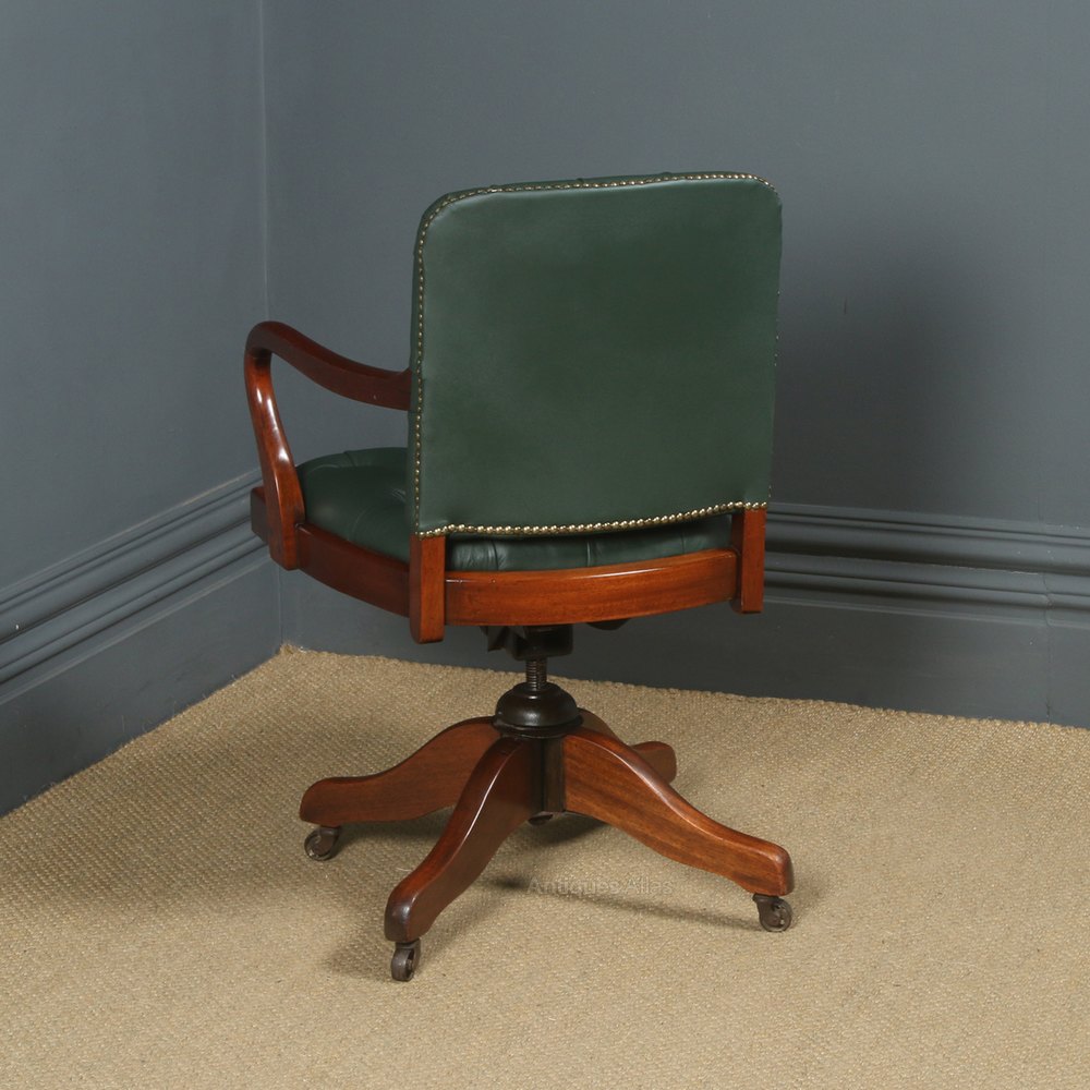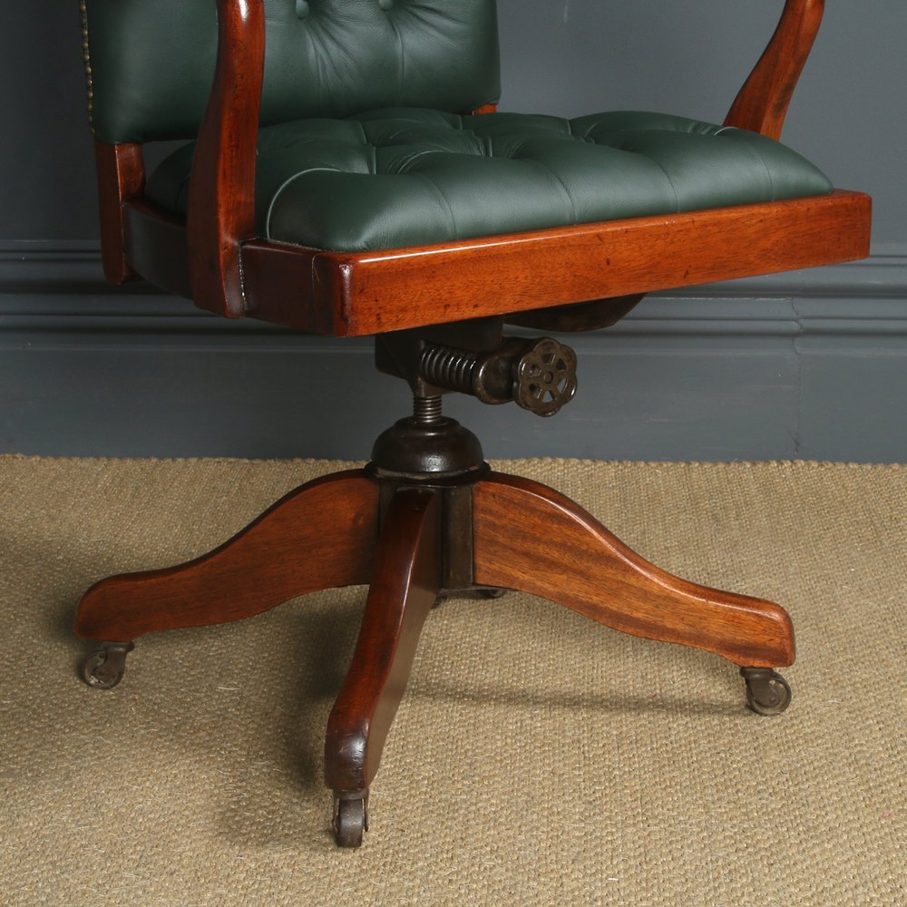 Condition This is a fine quality antique English George V mahogany leather desk chair, which has been newly upholstered, circa 1920, in excellent condition. Nominal old use marks to the leading edges of the mahogany chair frame and seat but nothing significant considering the age of the item. The revolving office chair has been newly upholstered to a professional standard in top quality full grain green leather, finished with hand-tacked brass studs to the perimeter. Therefore, the leather is in excellent condition, with no signs of wear and tear, damage or holes etc. The office chair frame incorporates the traditional brass studwork tacks to the perimeter. The swivel chair frame has been cleaned and French polished, by hand, to a professional standard. Therefore, the colour and patination are of an excellent standard. The original reclining and adjustable height mechanism is in good working condition having been stripped down, cleaned and serviced. There is some play to the mechanism but this is perfectly acceptable, and in line with the age of the chair. The mahogany leather desk chair retains its original steel castors, which are in good working condition.