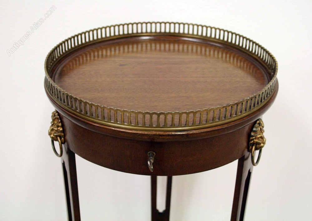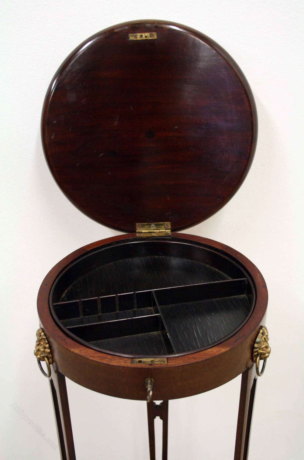 Circa 1880, unusual circular jardinière stand. The solid mahogany dish top has a wrap around open fretwork brass gallery. Unusually the top has a lock at the front, and opens to show a lift out fitted interior. The whole piece stands on four unusual open fretwork legs, with cast brass lion mask ring handles at the top. The legs taper towards the base. There is concave platform shelf at the bottom and the whole piece stands on 3 cast brass hairy paw feet. Excellent side table or lamp table.