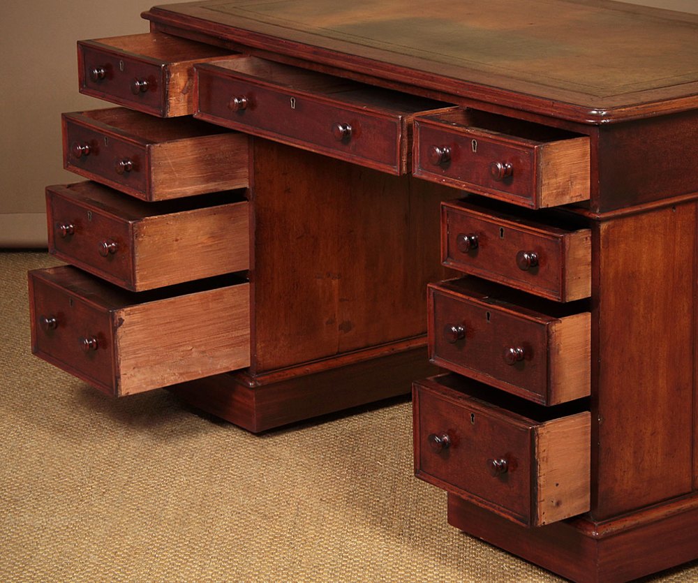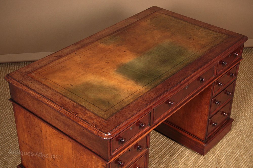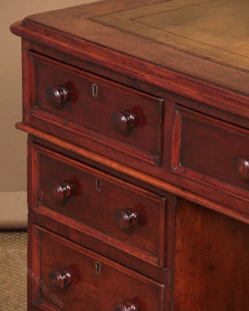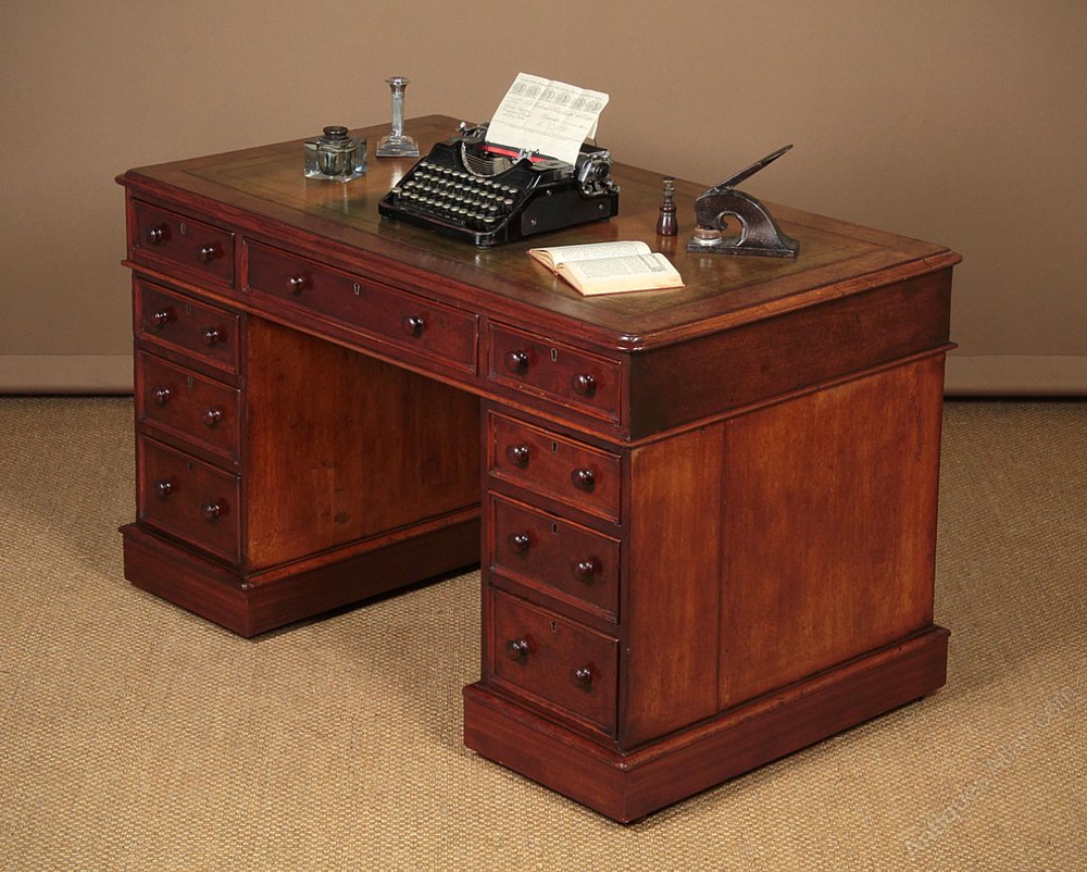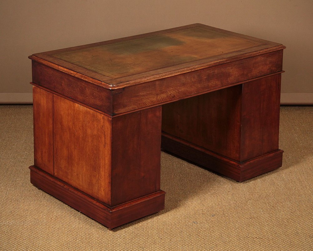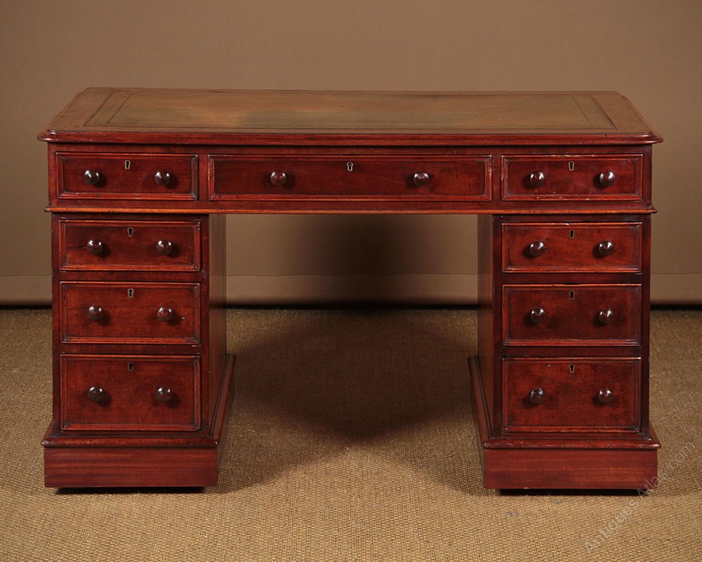 Good quality mid 19th.c. mahogany pedestal desk c.1870. 47″ x 28″ top with a leather writing surface and thumb moulded edge over three drawers. On twin pedestals each with three drawers of graduated depth with moulded edges to the drawer fronts and original turned mahogany knobs. Moulded plinth and original castors below. Solid mahogany sides and rear to the pedestals, mahogany drawer linings. Faded leather (could be replaced if preferred) and some typical wear. Otherwise very good condition. Cleaned and waxed in our workshops. Key supplied.