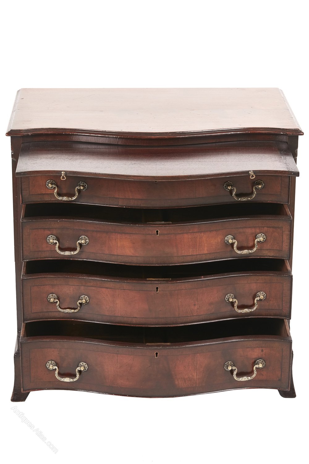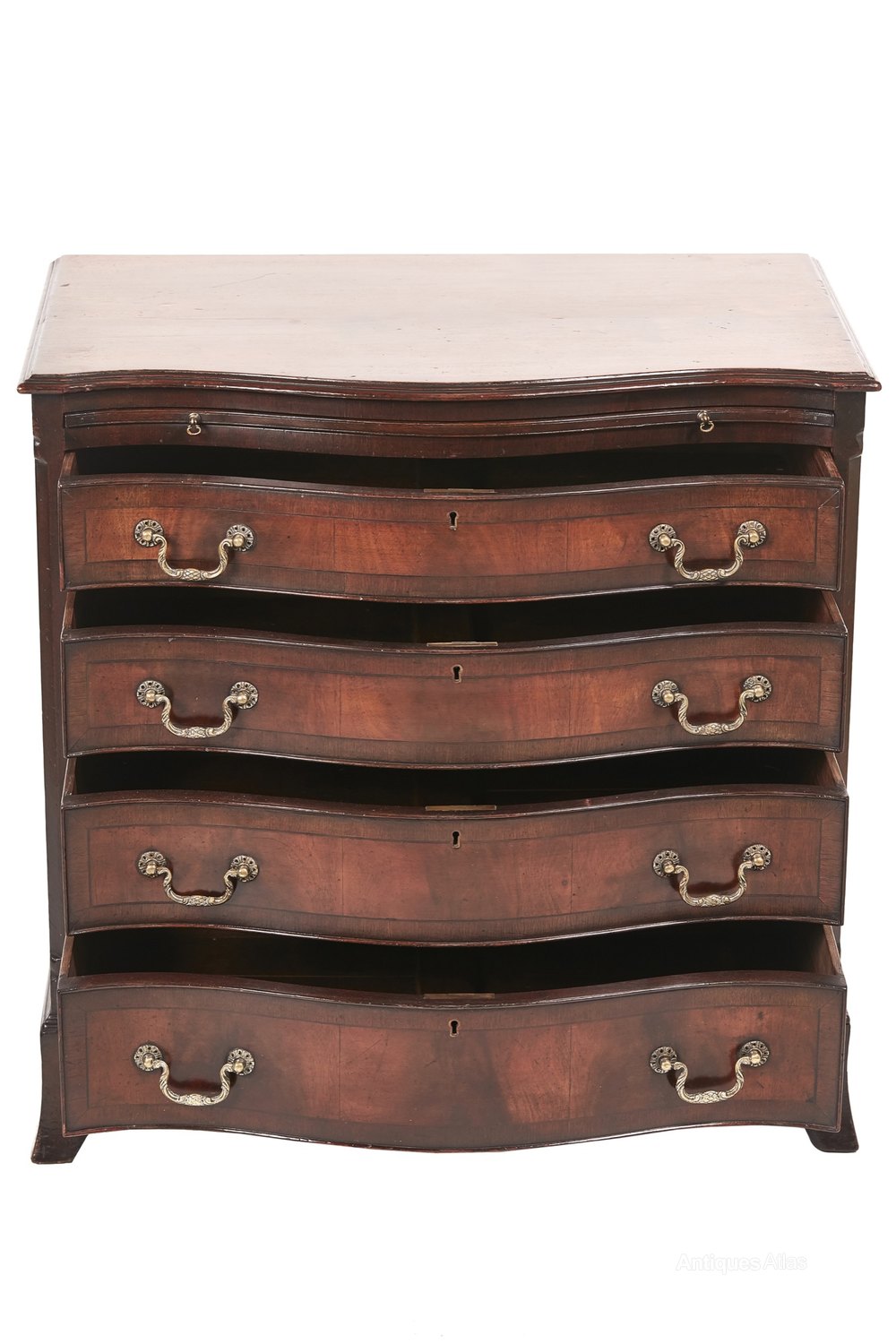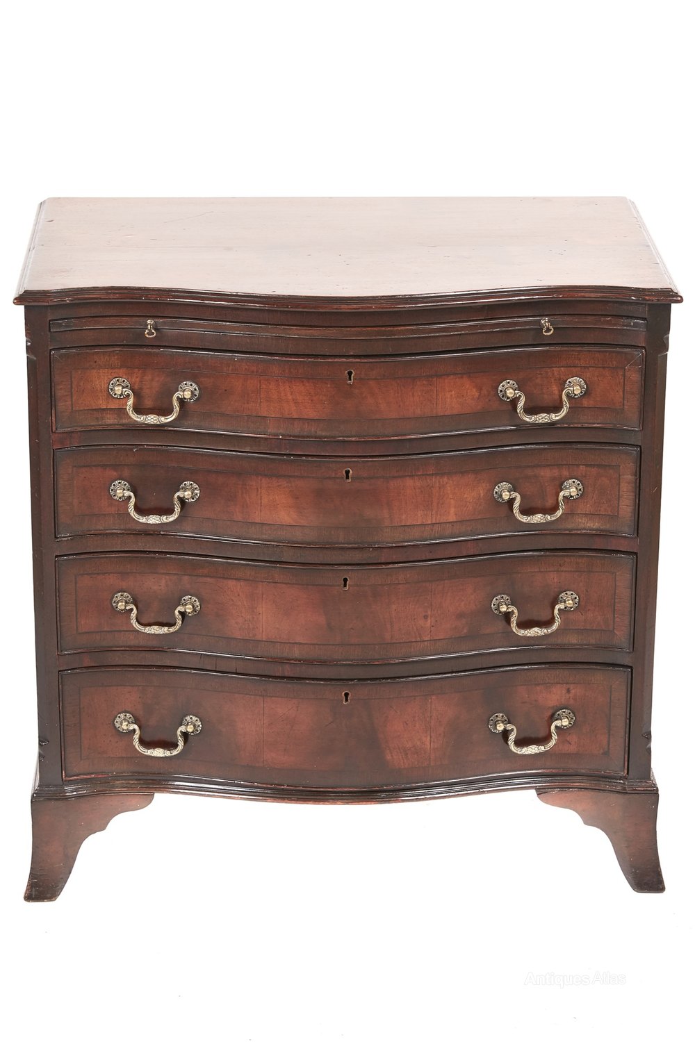 Mahogany serpentine shaped chest of drawers,having a lovely Mahogany serpentine shaped top with a moulded edge,brushing slide,four crossbanded mahogany serpentine shaped drawers with original brass handles,standing on shaped bracked feet