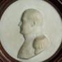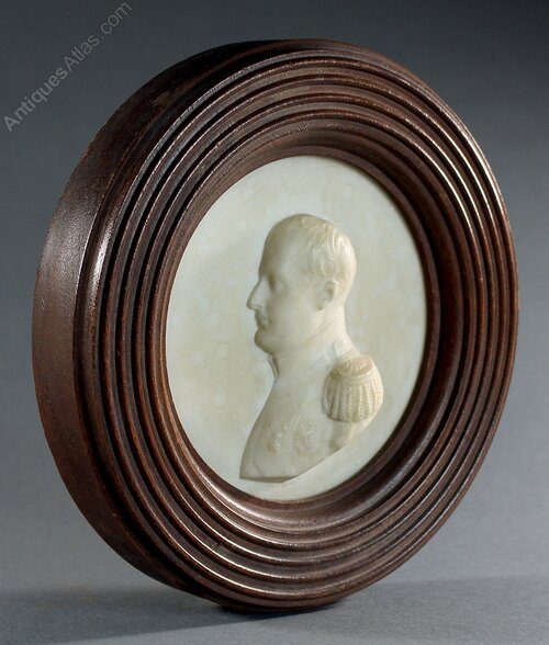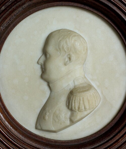 Rare French 19th century white marble bas-relief profile portrait plaque of the Emperor Napoleon. Nicely carved portrait of Napoleon in military uniform very similar to official portraits of Napoleon struck on commemorative medals towards the end of the Empire period by Depaulis (see Bramson 1323 The Battle of Wurtchen). Nicely mellowed white marble plaque presented in its original reeded wooden frame with a hanging loop.
