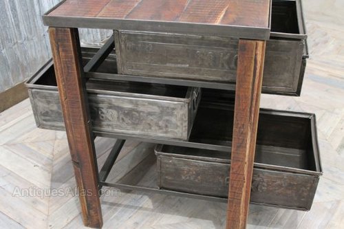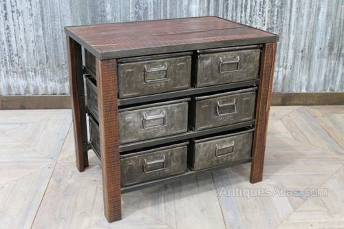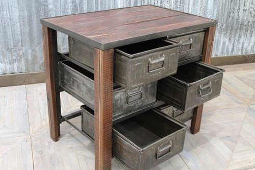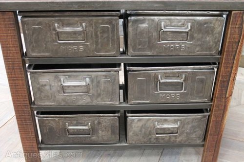 The unit is a stylish rework of vintage materials it features six ammunition crate drawers and has a reclaimed wooden top.