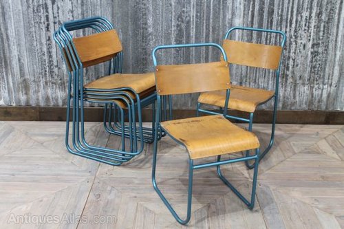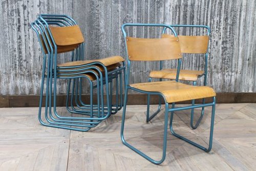 Their unusual blue paint colour makes these chairs a standout piece for any industrial space.