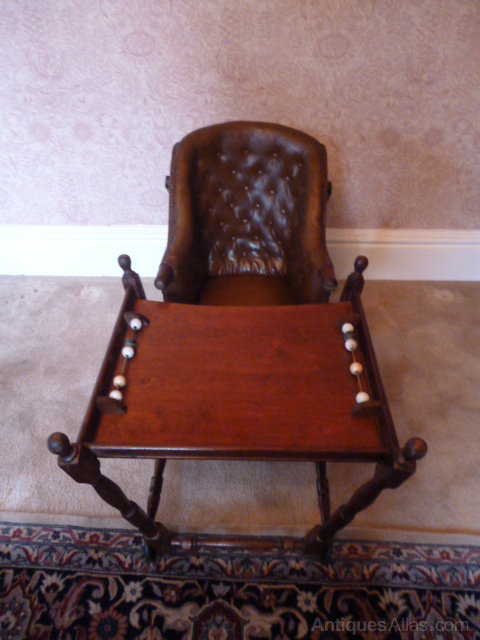 This is a very good quailty, late Victorian Mahgoany child's high chair. The seat has deep bottons to back and sides and covered in brown leather, the chair has a removable foot rest.