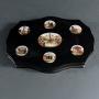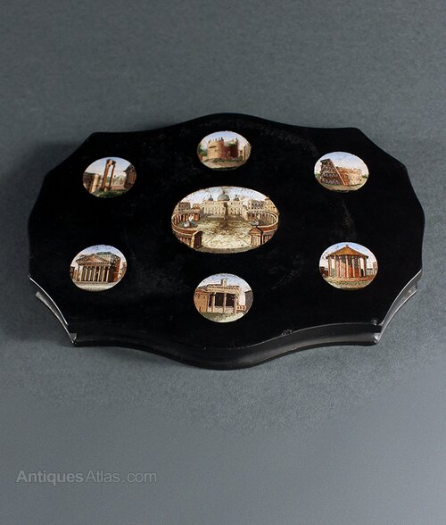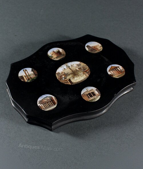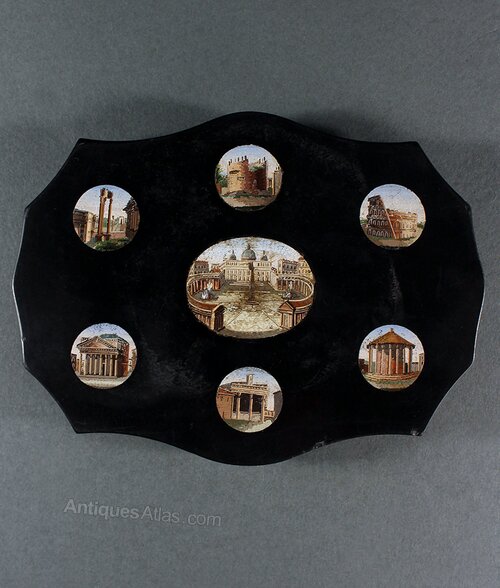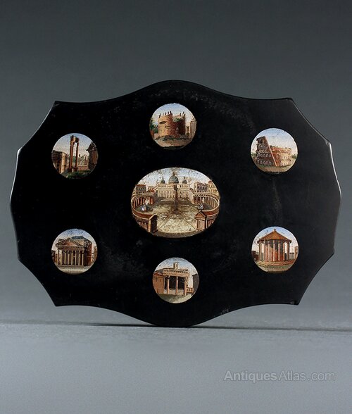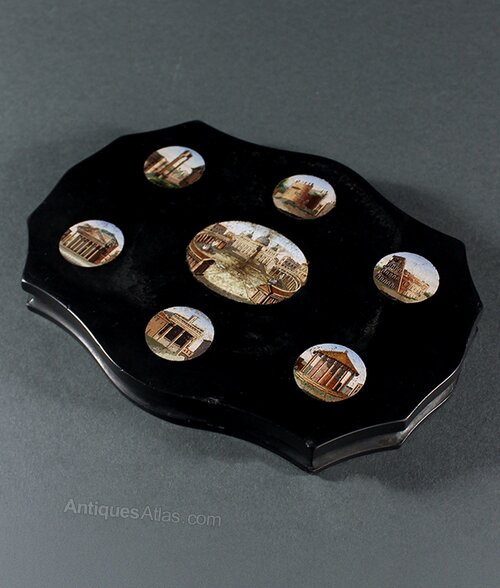 A good quality late 19th century Grand Tour micromosaic paperweight depicting seven vignettes of views of the ancient sites of Rome set into Marmo Negro scalloped edge base. The seven views being the Piazza San Pietro surrounded by the Forum with the Temples of Vespesian and Titus and Saturn, the Tomb of Caecilia Metella, the Colosseum, the Temple of Hercules Victor, The Pantanos Arch and the Pantheon. Some small flea bites to the edge as shown. Rome, circa 1860.