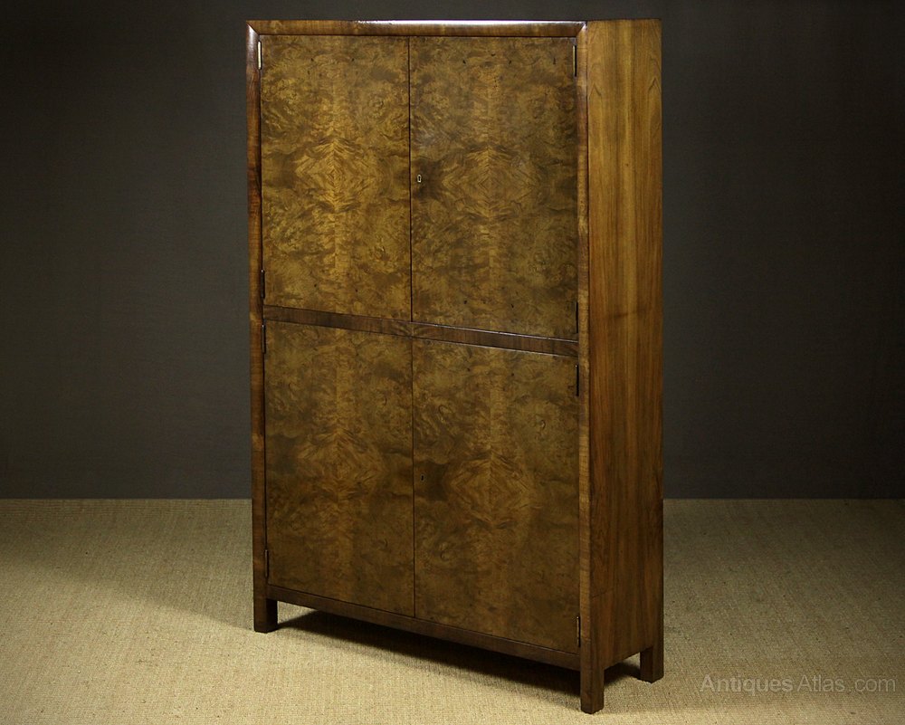 Very stylish mid 20th.c. walnut double height side cabinet for drinks etc c.1950. The simple modernist design emphasises the stunning burr walnut veneers which are arranged in a symmetrical pattern across the door fronts, but notice also the cushion shaped crossbanding to the surrounding edge. Matched veneers to the sides, interior and shelf fronts. Adjustable shelves with brass fittings. Excellent colour and condition, cleaned and polished in our workshops. Keys supplied.