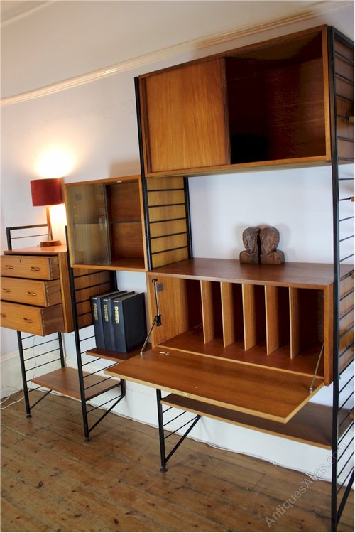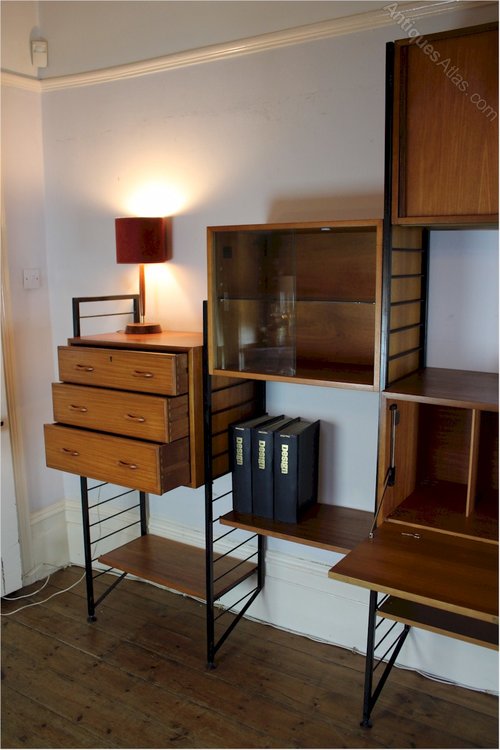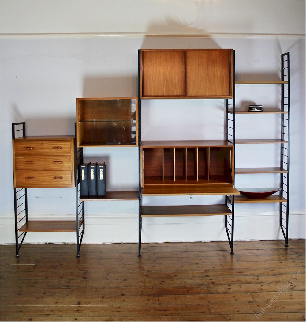 Mid-Century Ladderax Shelving system by Staples c1960's . Overall width 278 cm. 2 tall deep ladders , 1 tall narrow ladder and 2 short wide ladders. 1 small chest of 3 drawers (47 cm H X 59 cm W x 40cm D), 1 small glass display cabinet and 2 deep short teak shelves. 1 fall front LP / storage unit, 1 storage unit with teak sliding doors, 1 wide shelf and further 5 narrow short shelve 58.5 cm w x 20 cm D