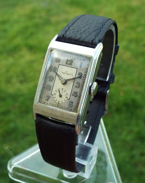 The dial is signed with a brand name, possibly Walthaw but difficult to read (at first glance, you might think it is Waltham but the typeface is completely different). There is a little marking and darkening to the dial. The infill has come out of the hour hand.