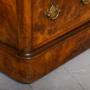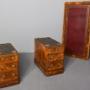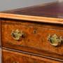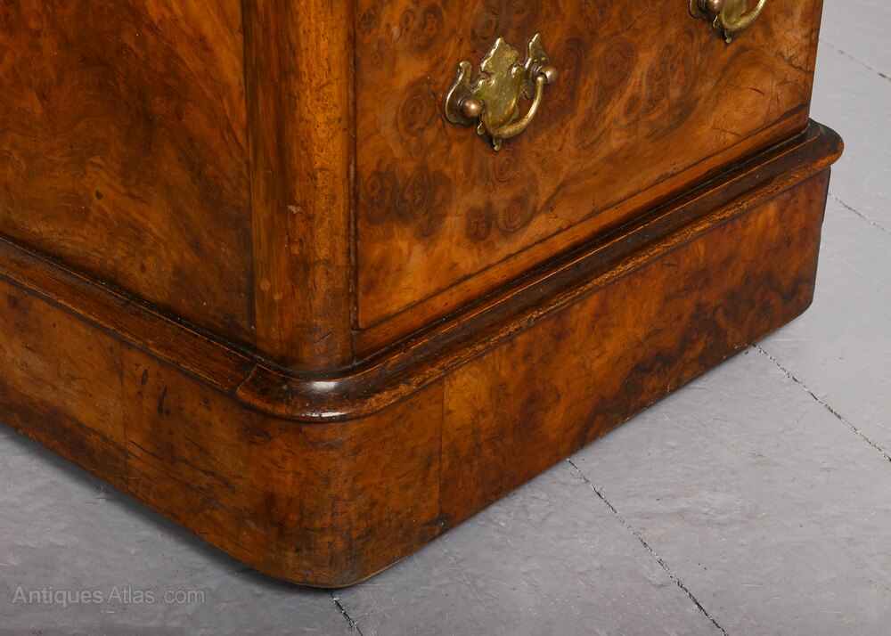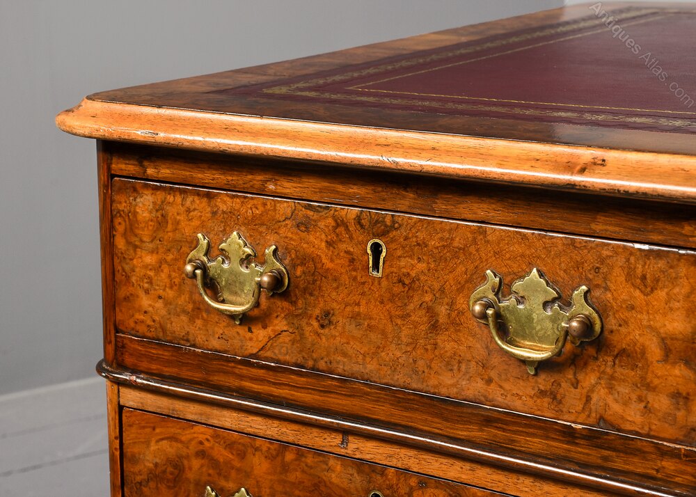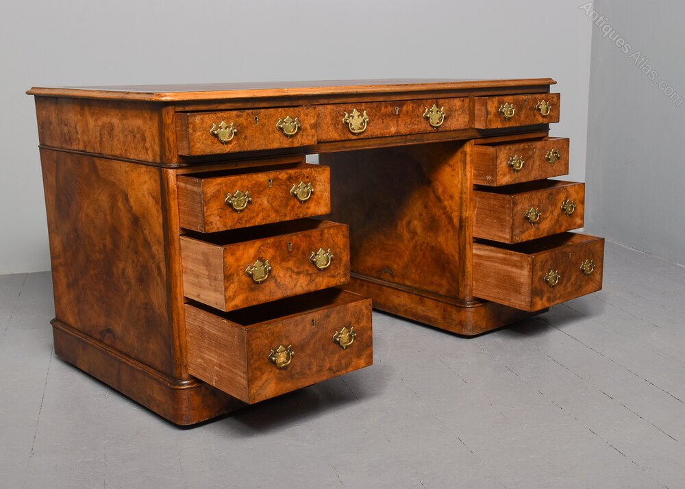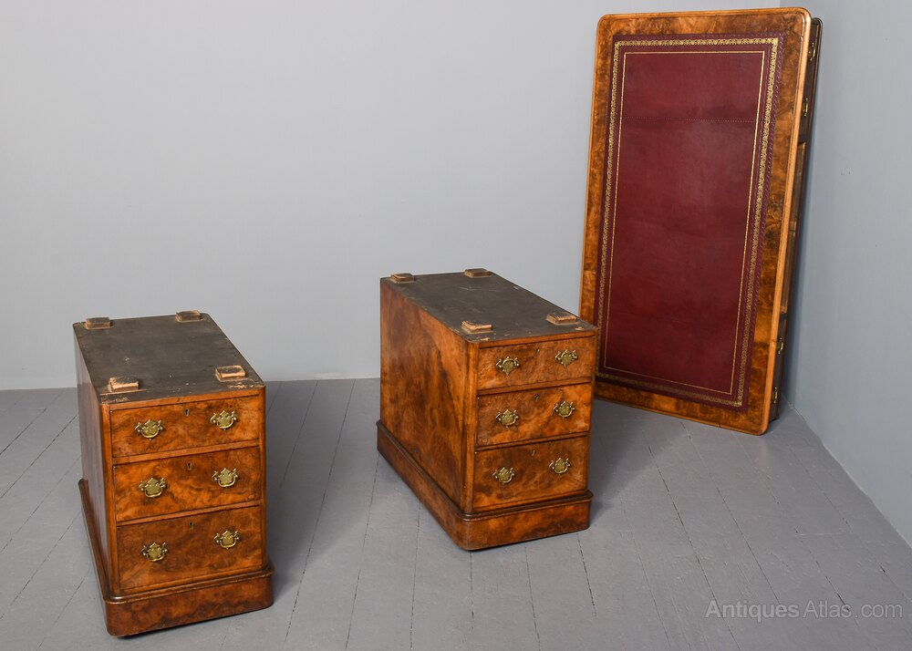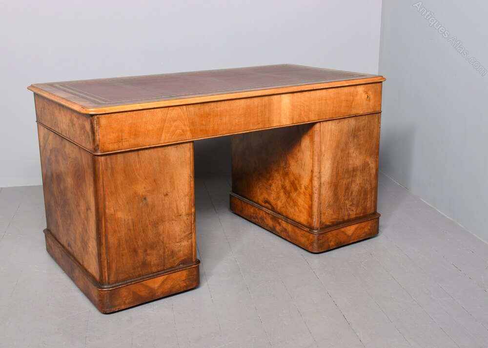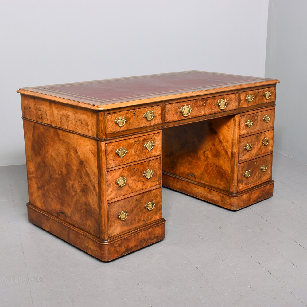 Circa 1860. A mid Victorian burr walnut three-part pedestal desk, the top with an insert tooled and gilded burgundy leather, with broad burr walnut banding and a moulded fore-edge, the frieze with one long drawer flanked by a pair of shorter drawers, each with cast brass swan neck handles with elegant back plates, resting on a pair of pedestals each with a bank of 3 drawers with similar handles and burr walnut facings, all with rounded corners and polished on all sides making the desk free standing, resting on an enclosed moulded plinth with concealed castors.