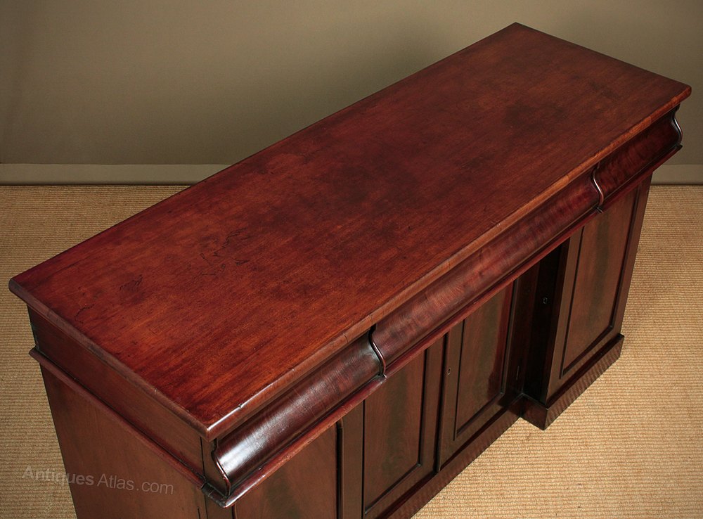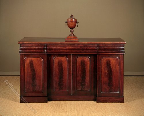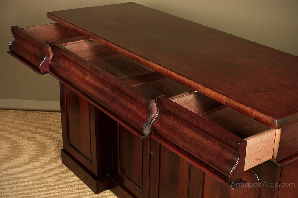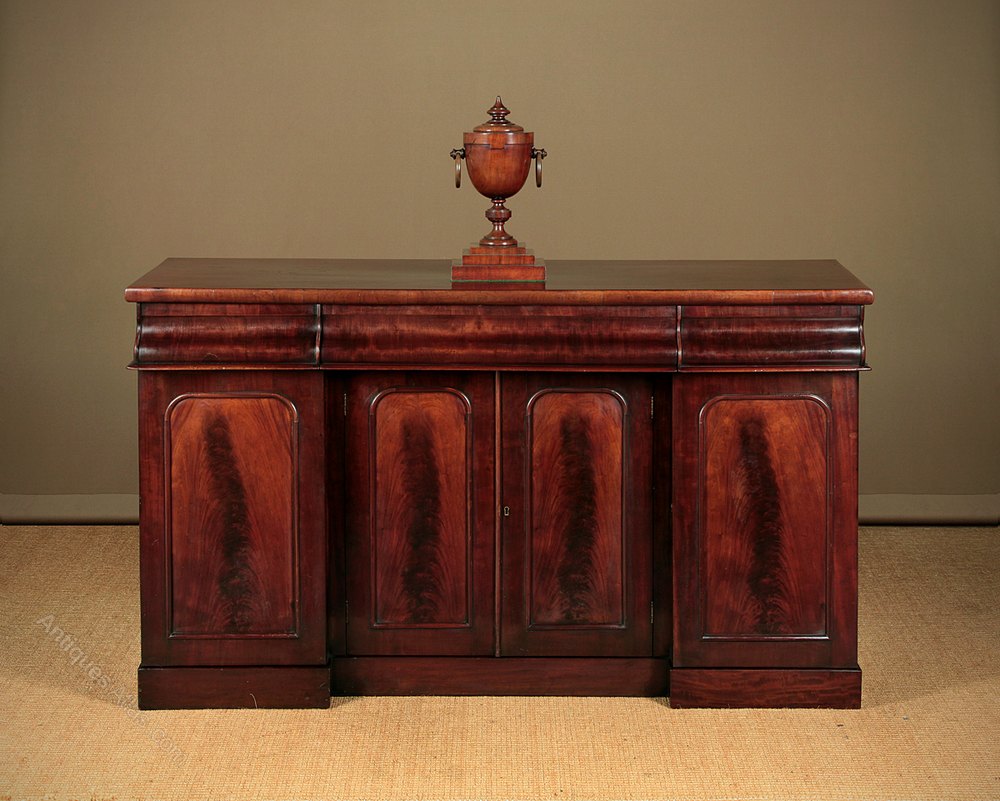 Mid 19th.c. mahogany chiffonier sideboard c.1860. Single piece solid mahogany top with crossbanded moulded edge, over three drawers and an inverted breakfront four door base fitted with original sliding shelves and bottle drawer. Shaped drawer fronts and superb matching flame mahogany veneers to the doors, on solid mahogany ground work. Solid mahogany sides and drawer linings. Some old scratches to the top, otherwise excellent colour and condition, cleaned and polished in our workshops. Keys supplied.