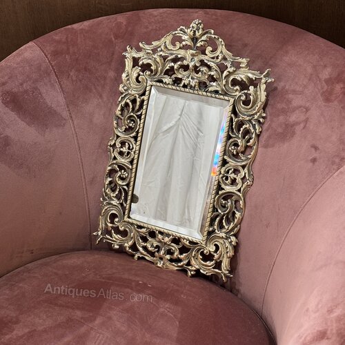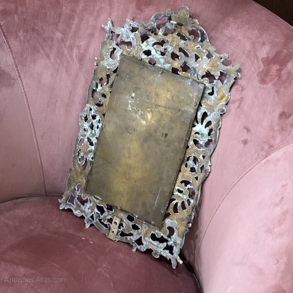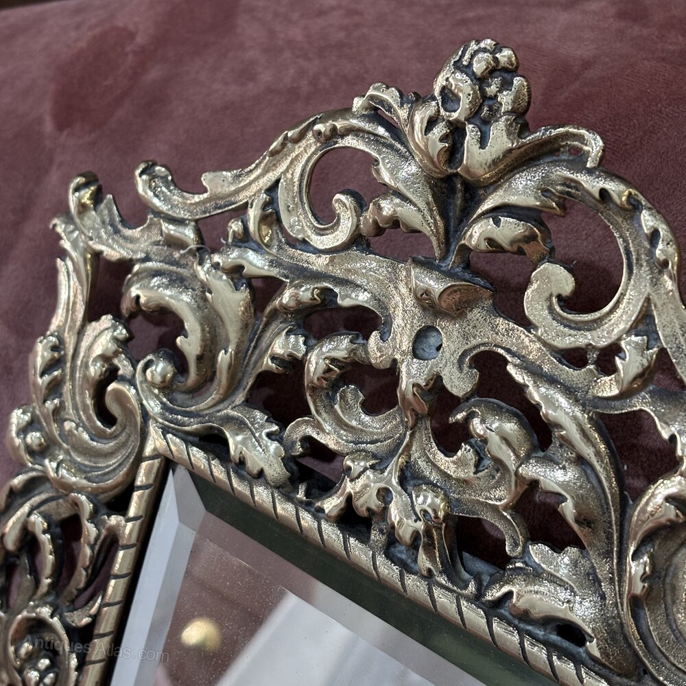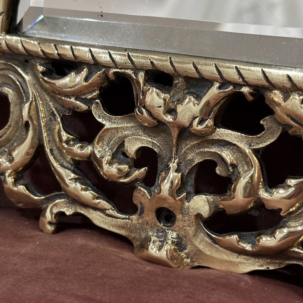 The brass has developed a warm, mellowed patina, highlighting the depth of the relief. The bevelled mirror plate is clean and bright, contrasting beautifully with the richly worked frame.