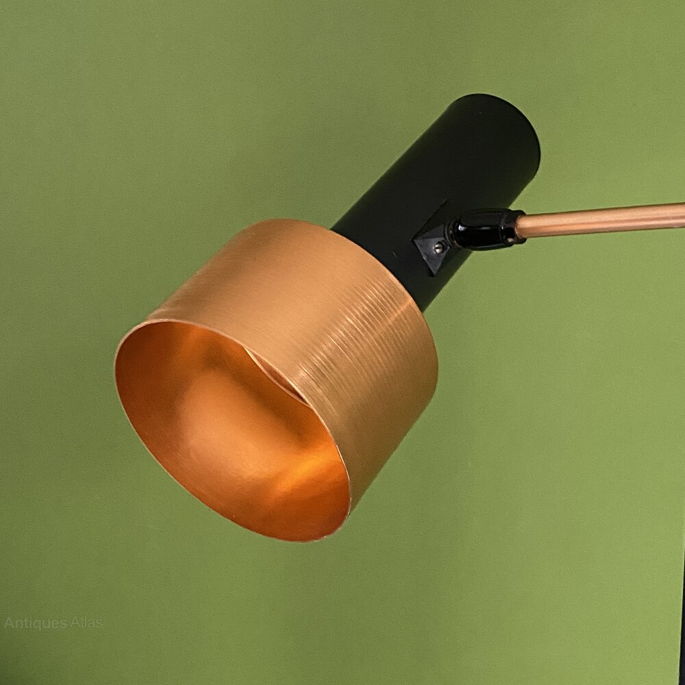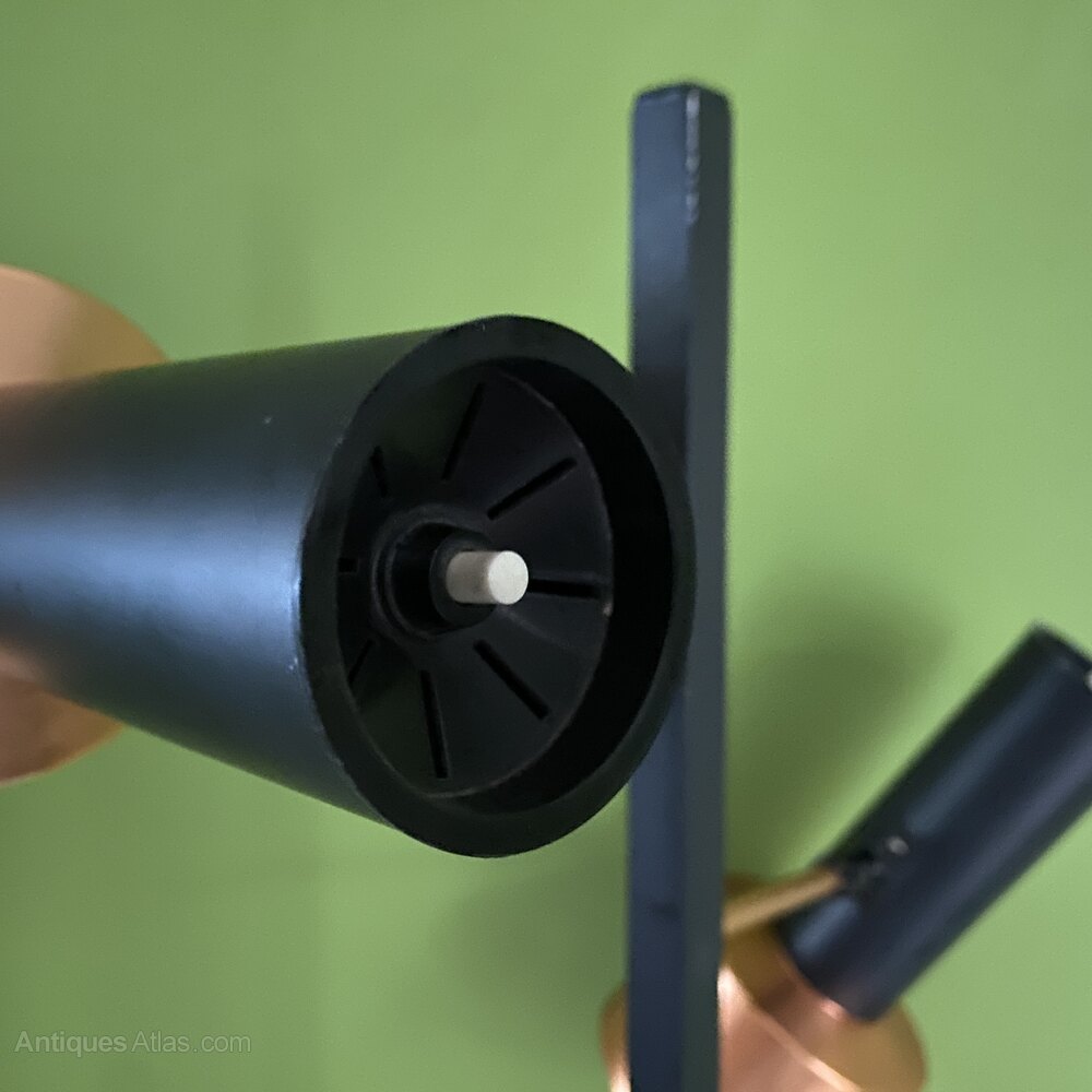 The lamp is in very good vintage condition and has been rewired and recently PAT tested with a generous white flex. There are a few minor scratches to the black paint on the metal pole which have been touched up in the past, although these can only be seen on close inspection, and a very minor scratch to one copper shade. One of the ball joints which allows the spotlight to be angled is a little loose, but does stay in position. The lamp takes standard bayonet cap bulbs (B22), 2 of which are included in the purchase.