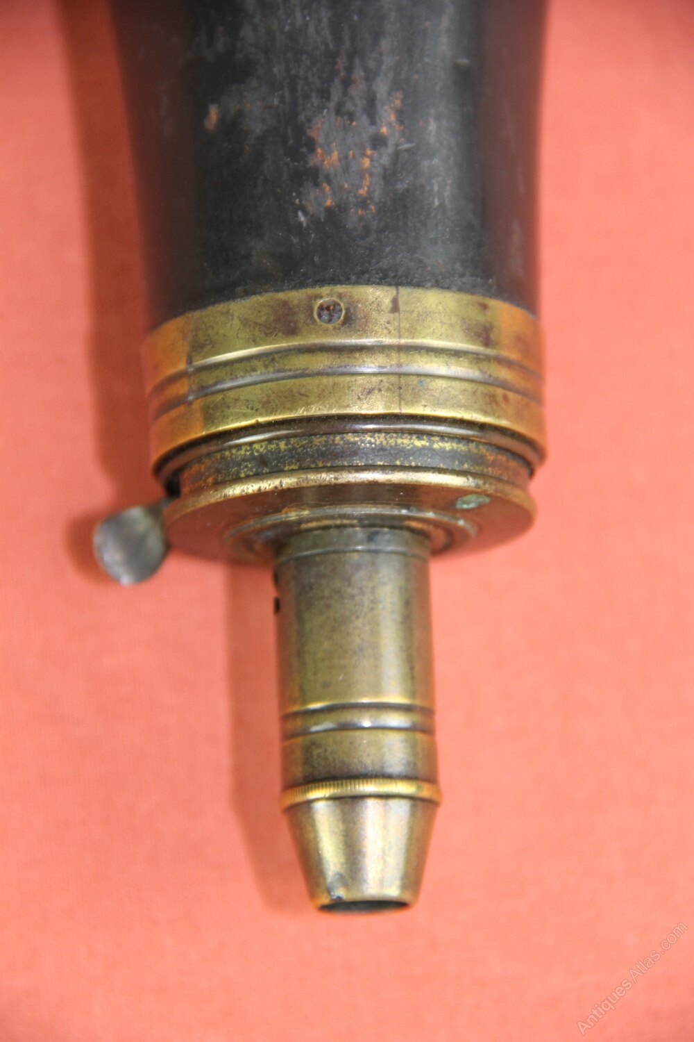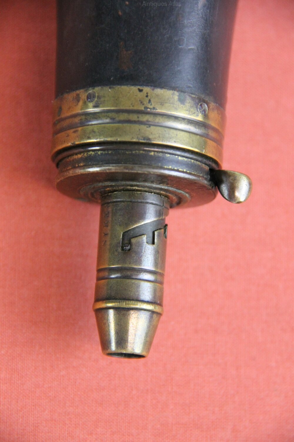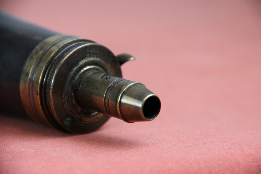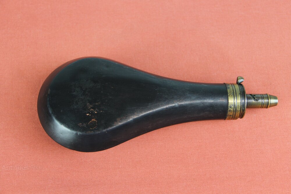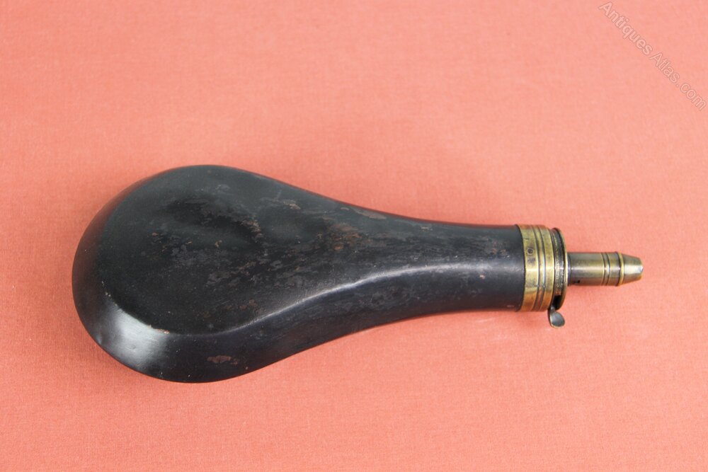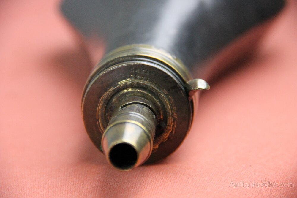 Mid 19th century large black copper Powder flask marked 'Sykes Patient'. Has an adjustable nozzle with 4 sizes and integral working main spring. In generally sound condition but some slight denting.