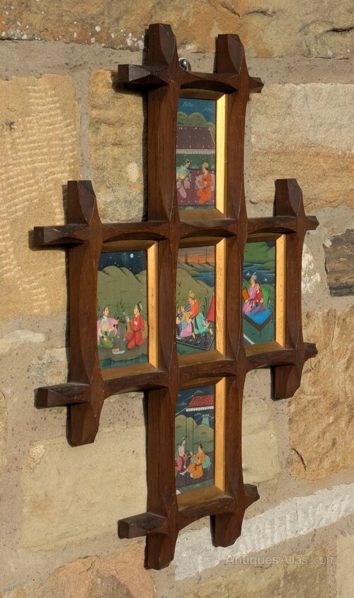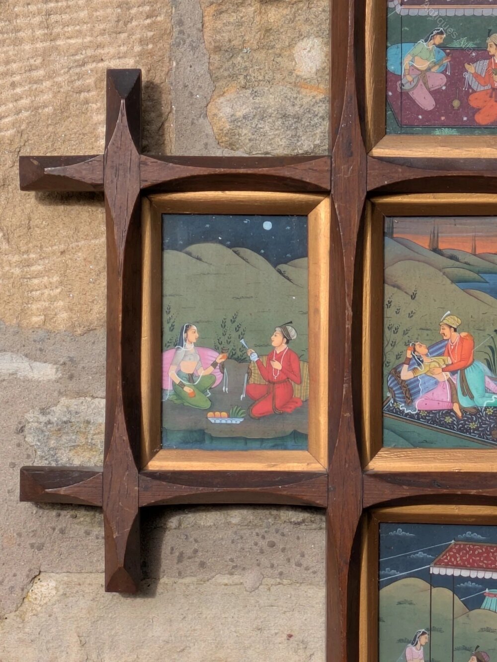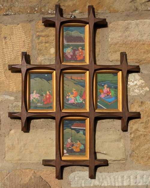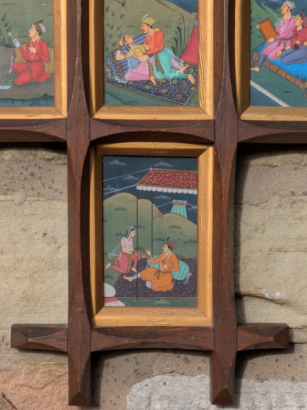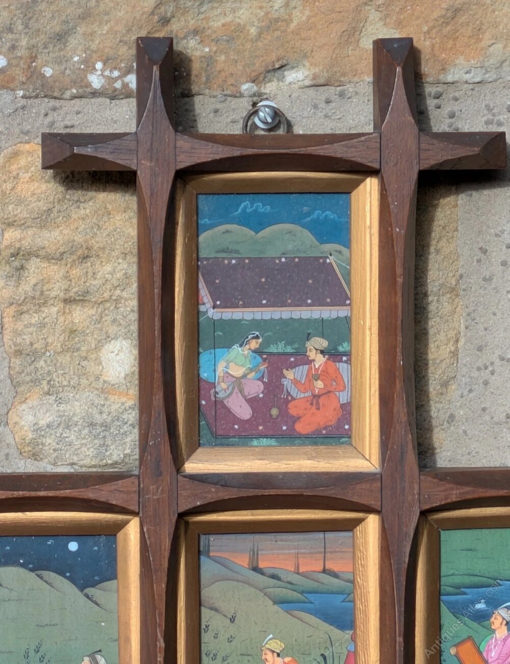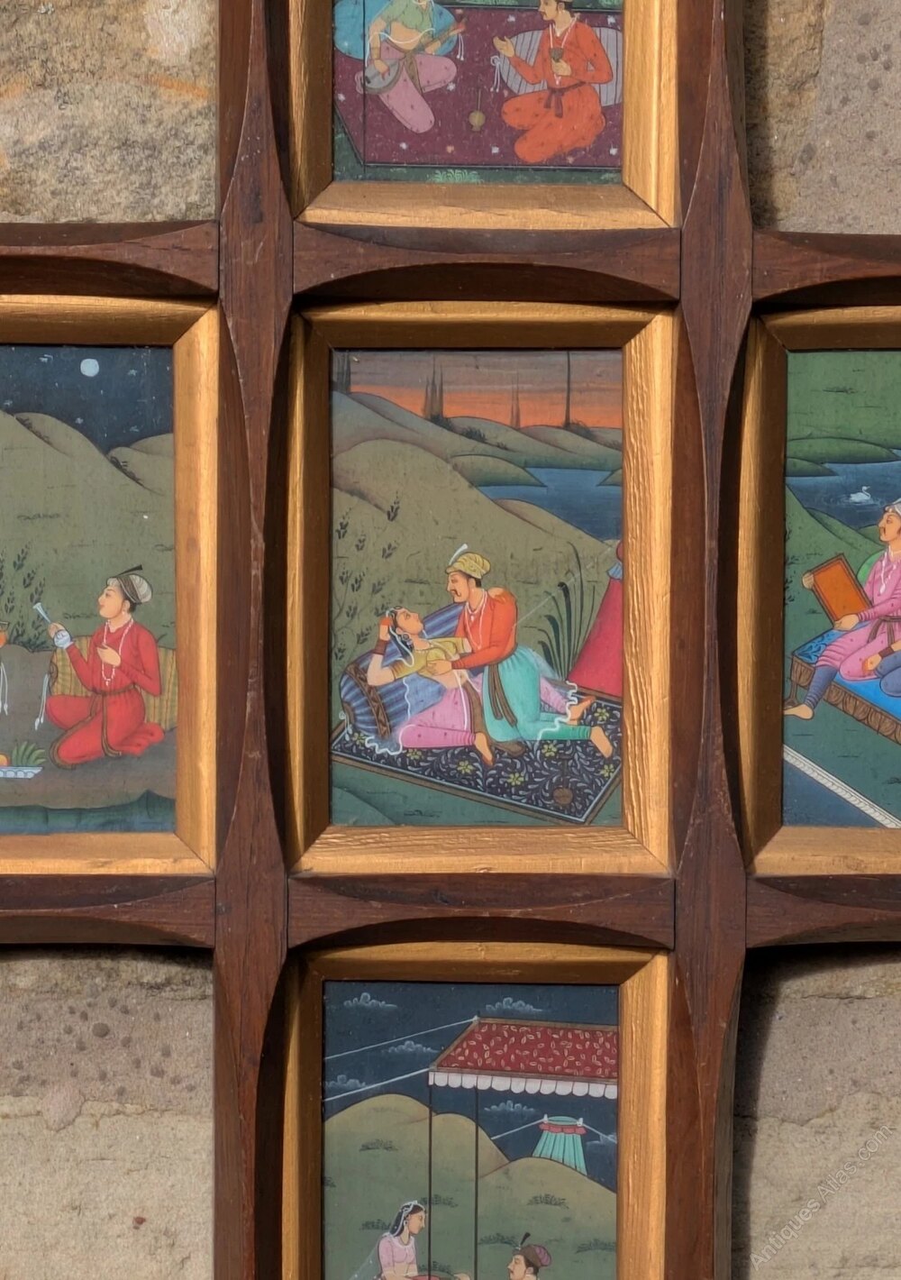 This is a very alluring set of five Mughal paintings of lovers dating from the mid 19th Century presented in bespoke oak cruciform frame. The paintings are all very well executed in strong gouche paintings and show courtly lovers in a variety of palace garden settings in the evening. These are all in excellent condition.
