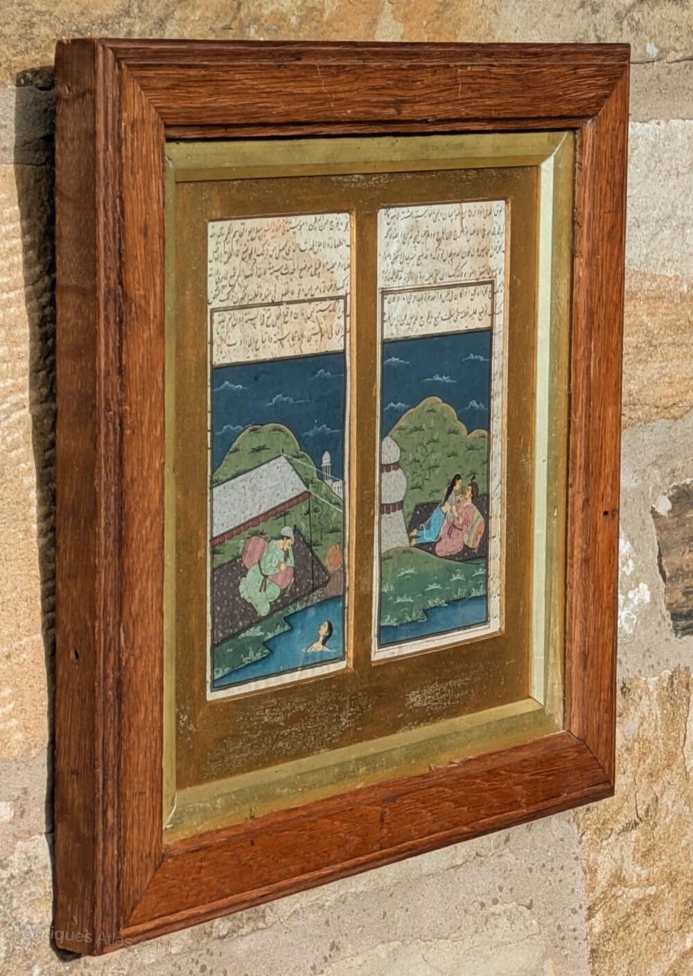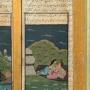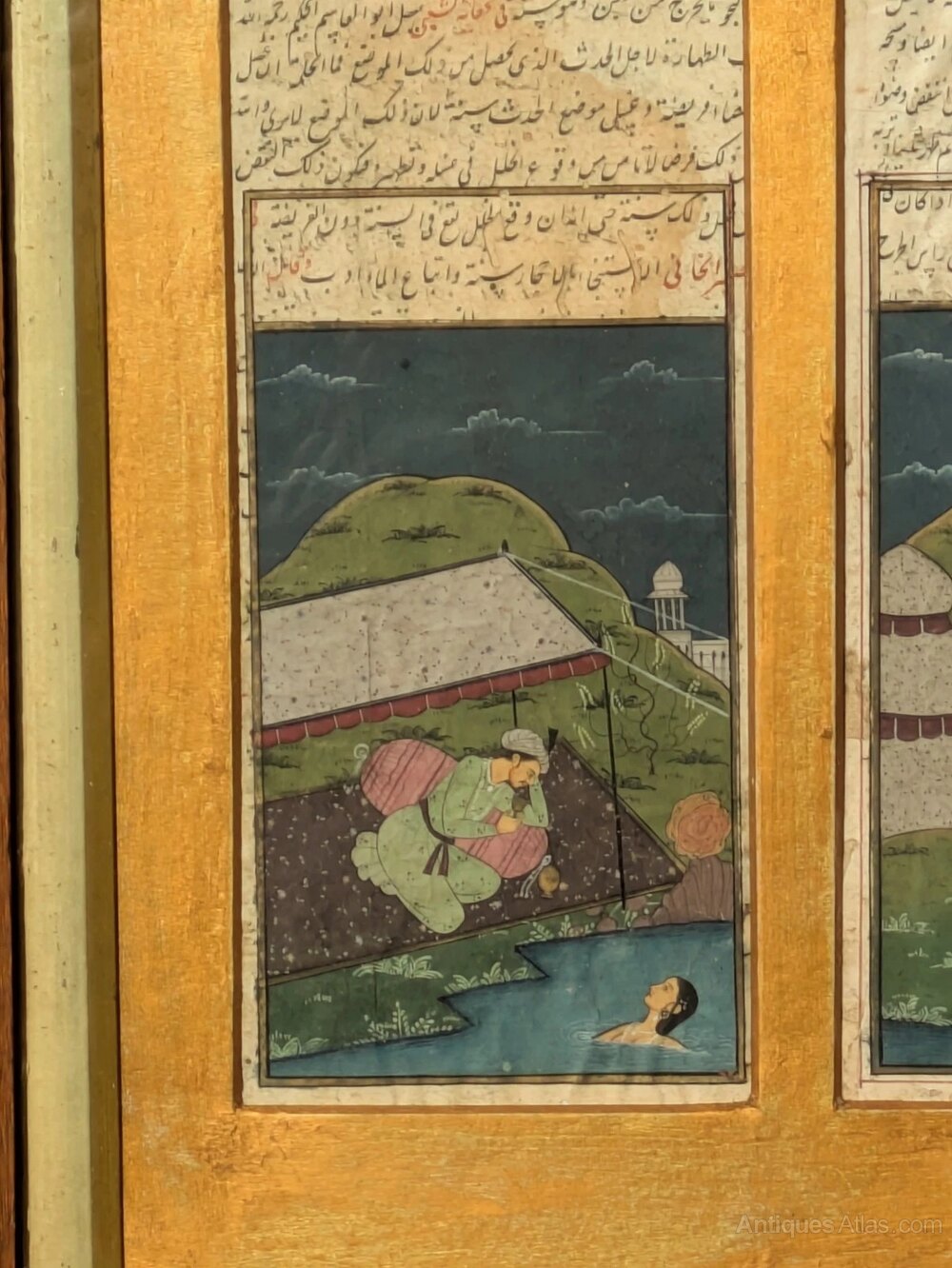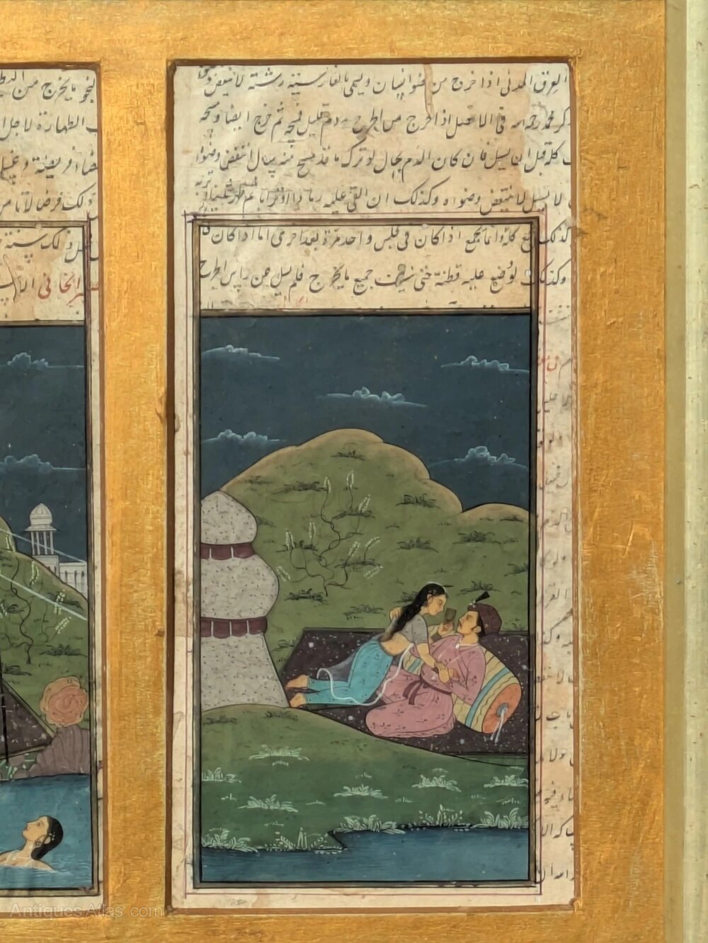 This is a beautifully painted pair of Mughal paintings dating from the mid 19th Century. The paintings depict lovers spending time together in a lakeside setting in the evening and both paintings have calligraphy to the top.