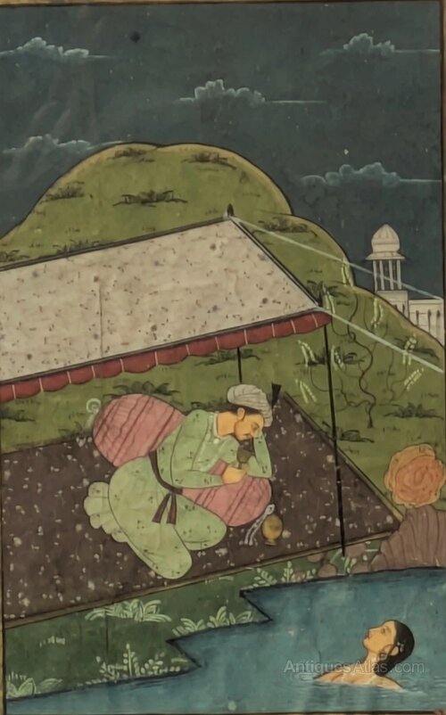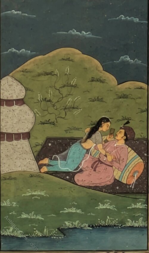 Mughal School Original Gouache Painting Lovers in lakeside