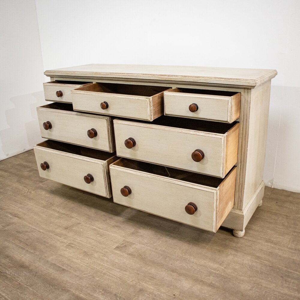 A multi-functional piece, this wonderful drawer base will work as storage in almost any room, including a country kitchen with freestanding antique furniture, a bedroom or a dining room. It provides four deep drawers of a great size and a further three above which are shallower. Painted in a lovely warm grey, it has a gently distressed appearance which will work well in a modern family home. Standing on bun feet, it has turned wooden handles with a beautiful contrasting colour to them.
