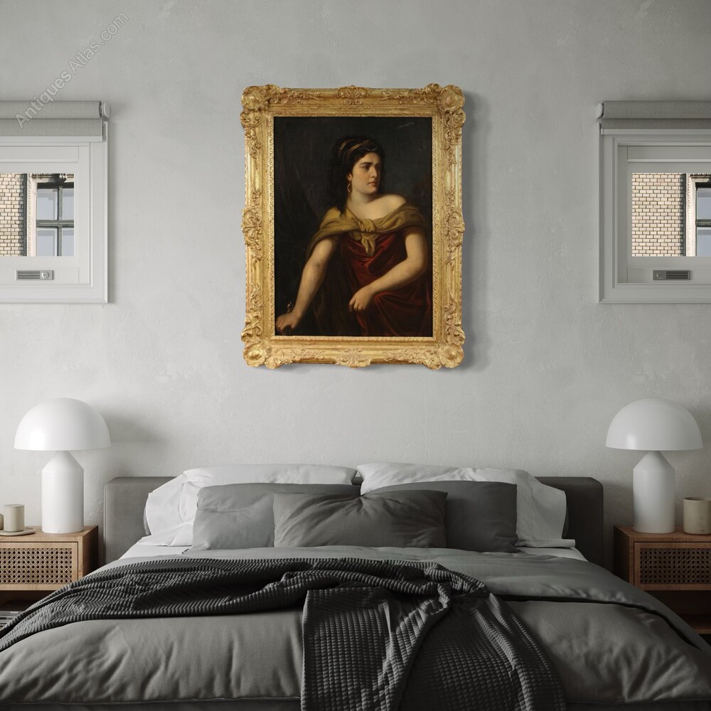 This painting of remarkable pictorial quality is distinguished by its sumptuous drapery and the rendering of the jewels, revealing the hand of a court portraitist. The marvelous golden earrings have metallic highlights, and the double headband in her hair is dotted with masterfully painted pearls. This artwork has a strong visual impact, ideal for spaces that convey refinement and elegance. Perfect for a study or stateroom, it is equally suited to both classic and modern settings.