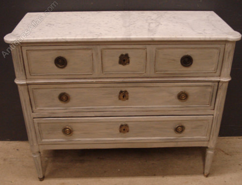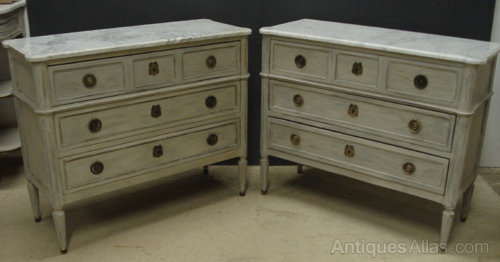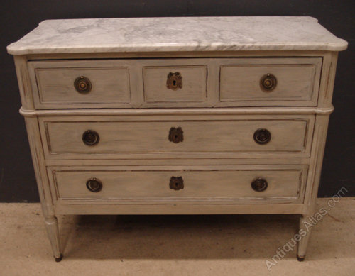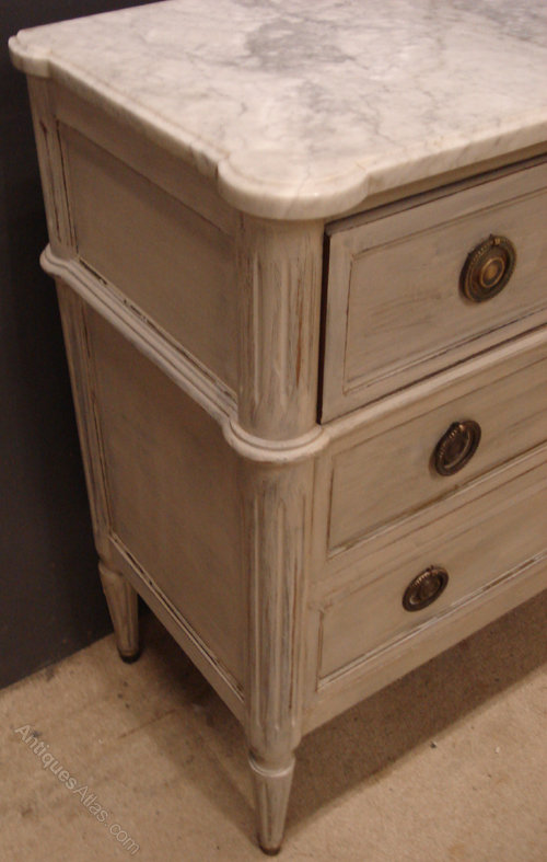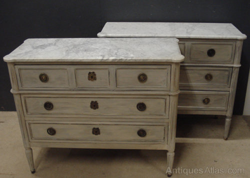 Ref 4171 - Near pair of worn pale grey painted Louis XVI style commodes. Original metal fittings. Original white/grey figured shaped marble tops. Circa 1950.