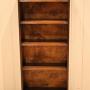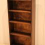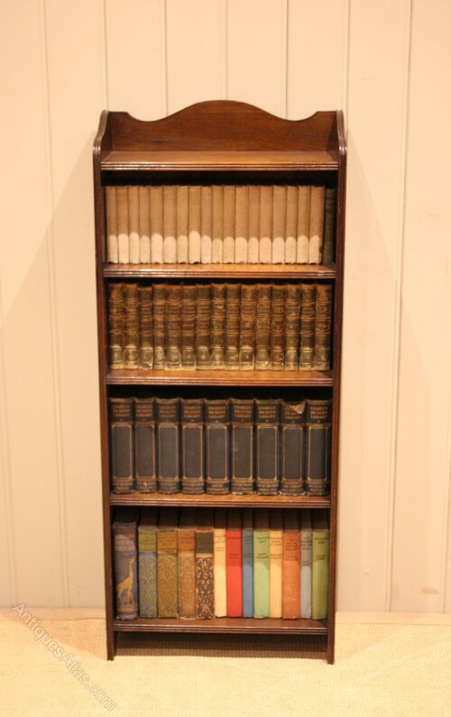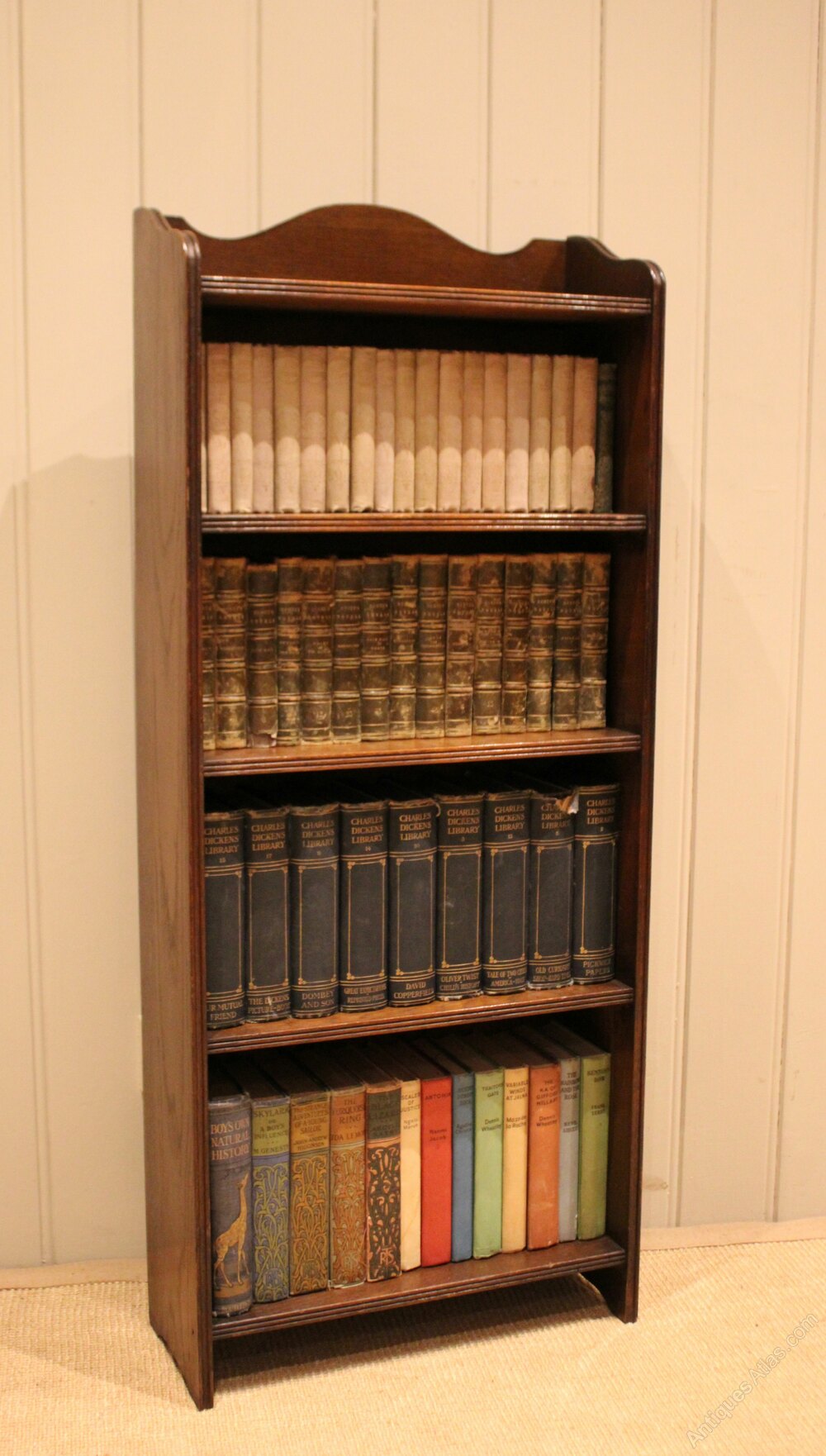 Oak open bookcase having four fixed shelves with reeded edges , raised on straight supports. The internal shelf dimensions are 42.5 cm wide x 16.5 cm deep and from the bottom upwards 25cm high , 22.5m high , 19cm high and 18 cm high