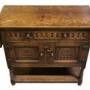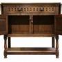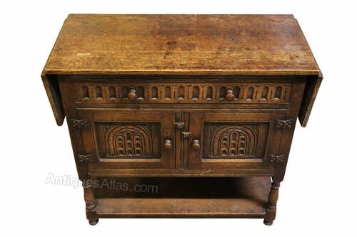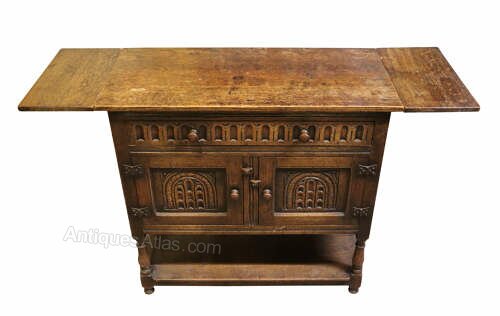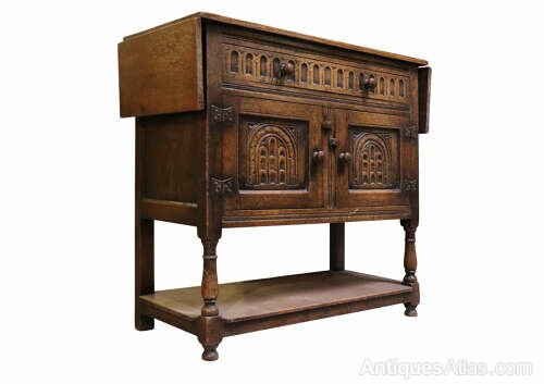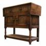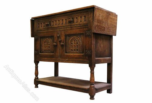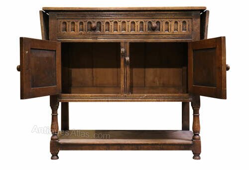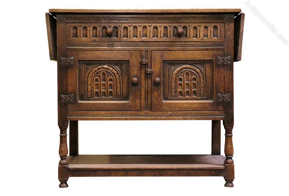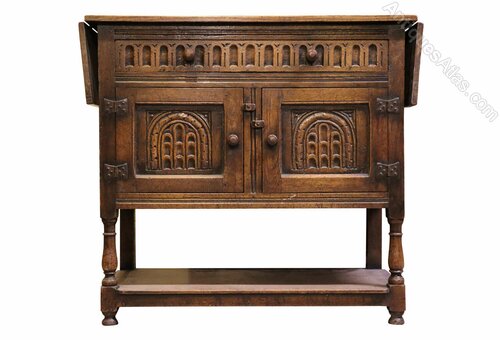 An excellent example of a 17thc style carved oak dresser base with drop flaps to the sides, long drawer with pair of doors under, standing on turned supports and with pot board under - Ipswich - circa 1910