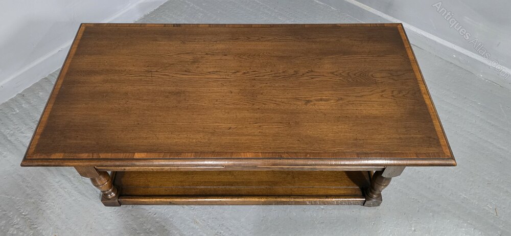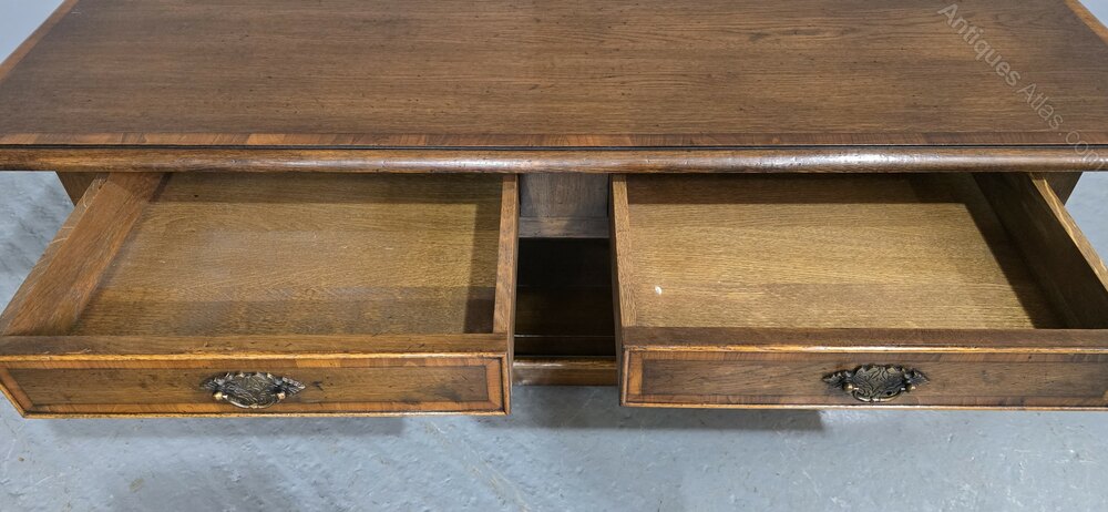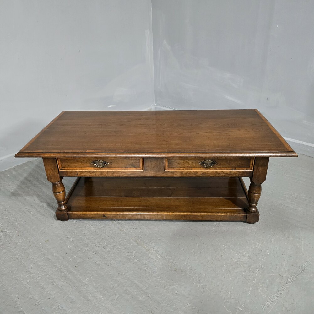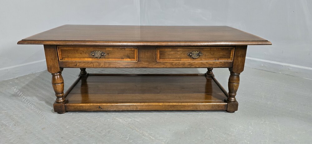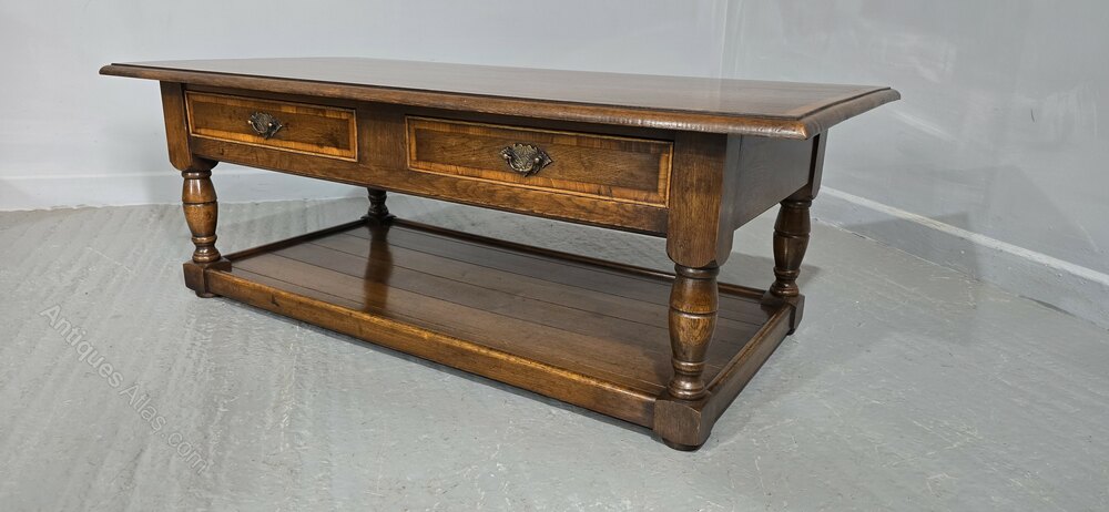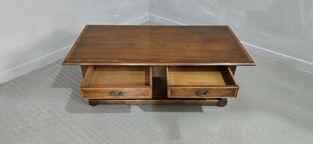 An excellent quality oak plank coffee table with two drawers, brass handles, and cross banded top and drawers, and plank undertier, in excellent condition.