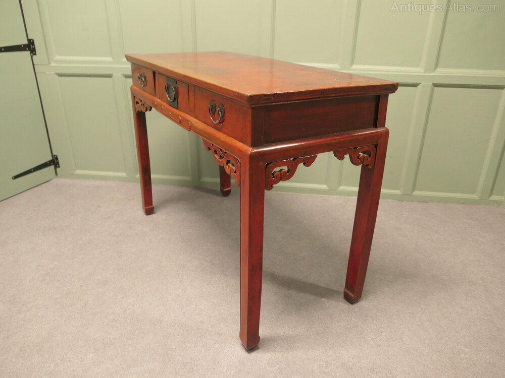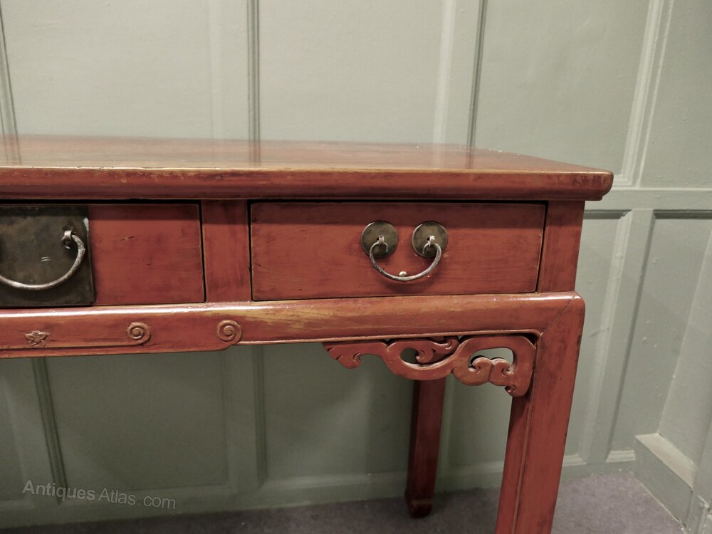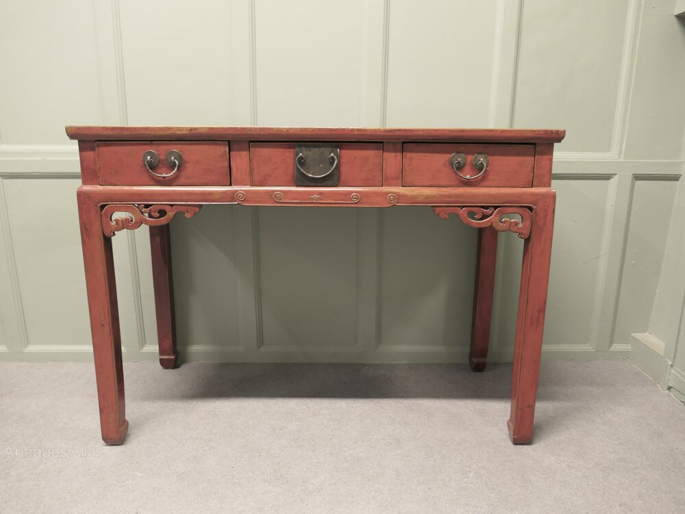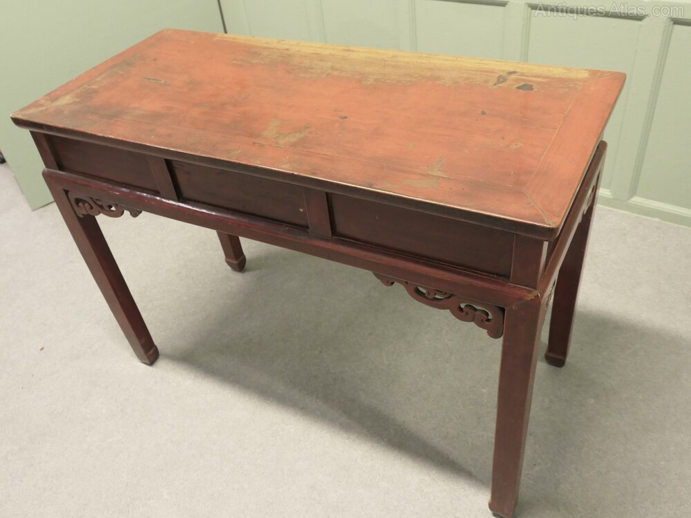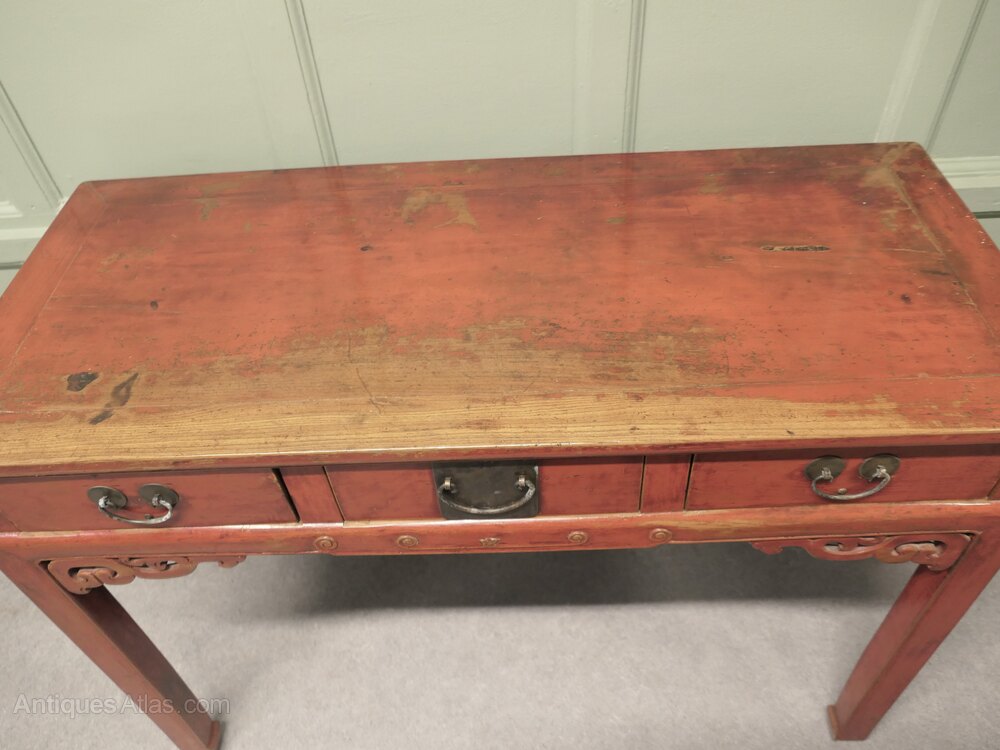 This is a very attractive piece, the table has a red lacquer finish, the table top has a cleated border which has superb worn patina where it has been lovingly polished for many years