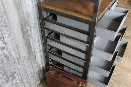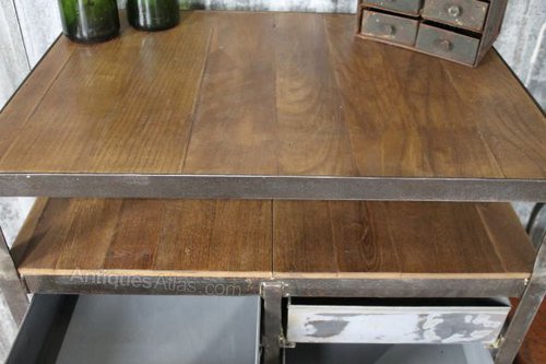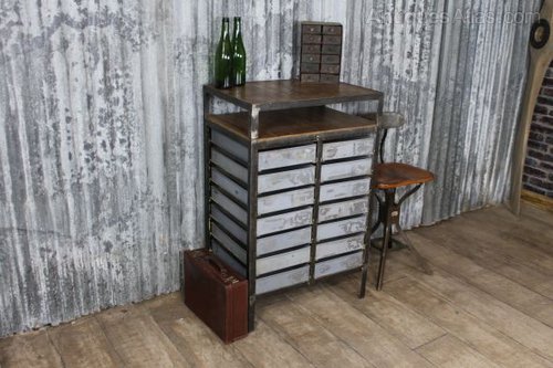 They feature various drawers and storage capabilities, and reclaimed wooden tops. These are all original industrial pieces that are suitable for domestic or commercial use in particular they could be used as coffee stations, sideboards etc.