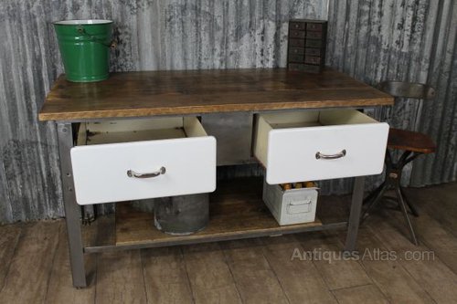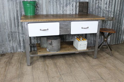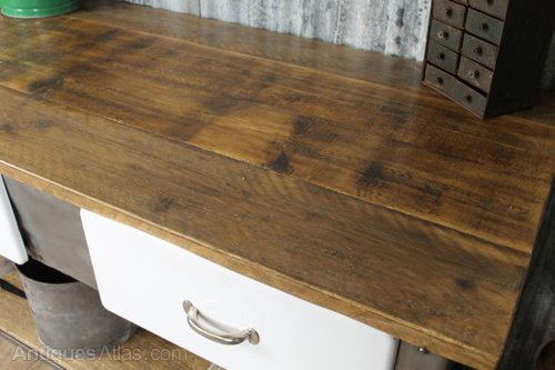 They feature various drawers and storage capabilities, and reclaimed wooden tops. These are all original industrial pieces that are suitable for domestic or commercial use in particular they could be used as coffee stations, sideboards etc.
