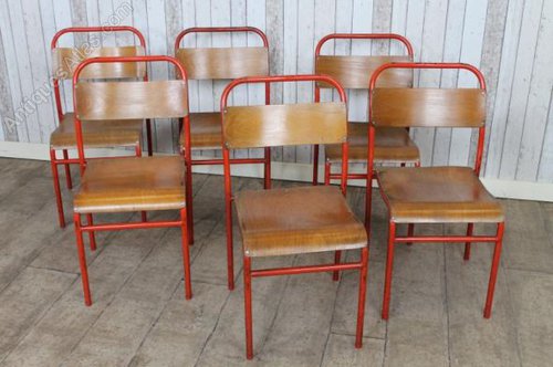 These vintage stacking chairs are extremely sturdy and feature red painted frames.