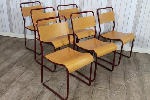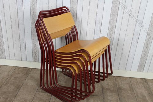 These superb and extremely sturdy original stacking tubular steel chairs are fitted with curved wooden seats and back supports.