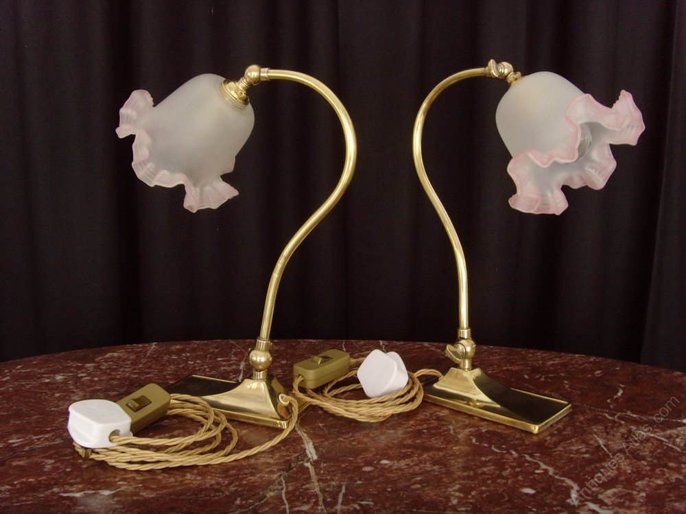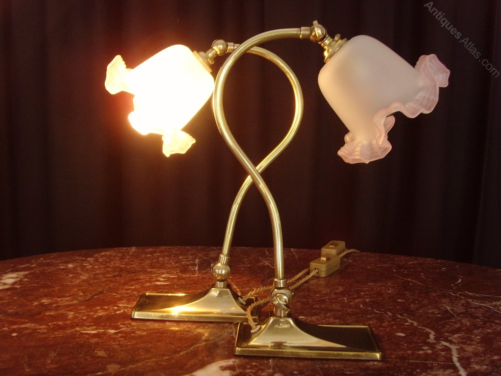 The bases are sloping, elongated rectangles in solid brass and the curved arms have ball and wingnut adjustment at the bases and at the necks. The bases of the lamps have been baized to protect antique furniture form marks.