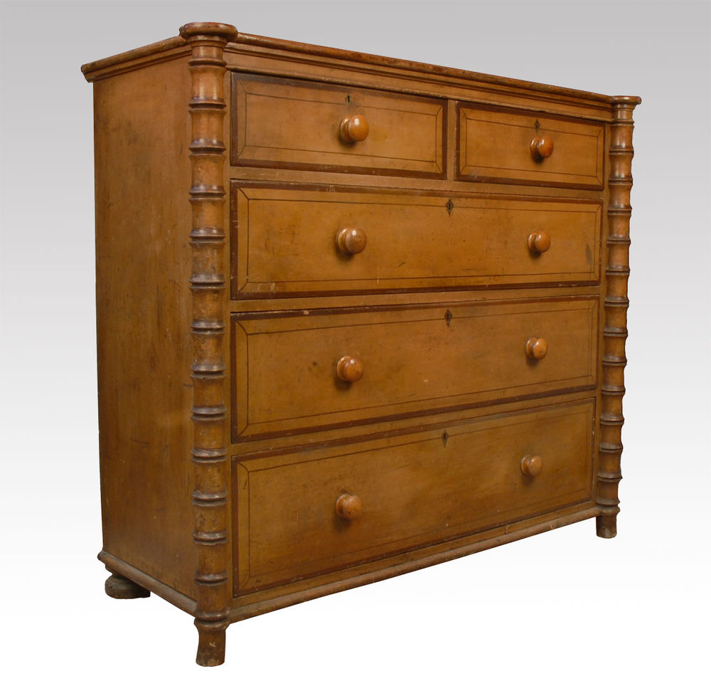 above two short and three long draws each having simulated inlay and wooden turned knobs flanked by bamboo simulated column terminating in shaped feet