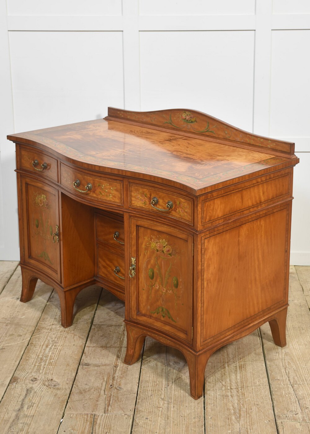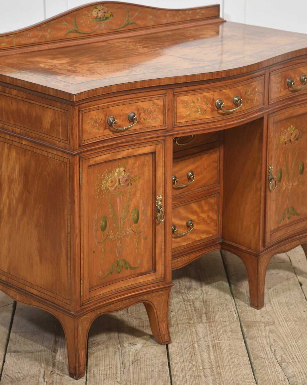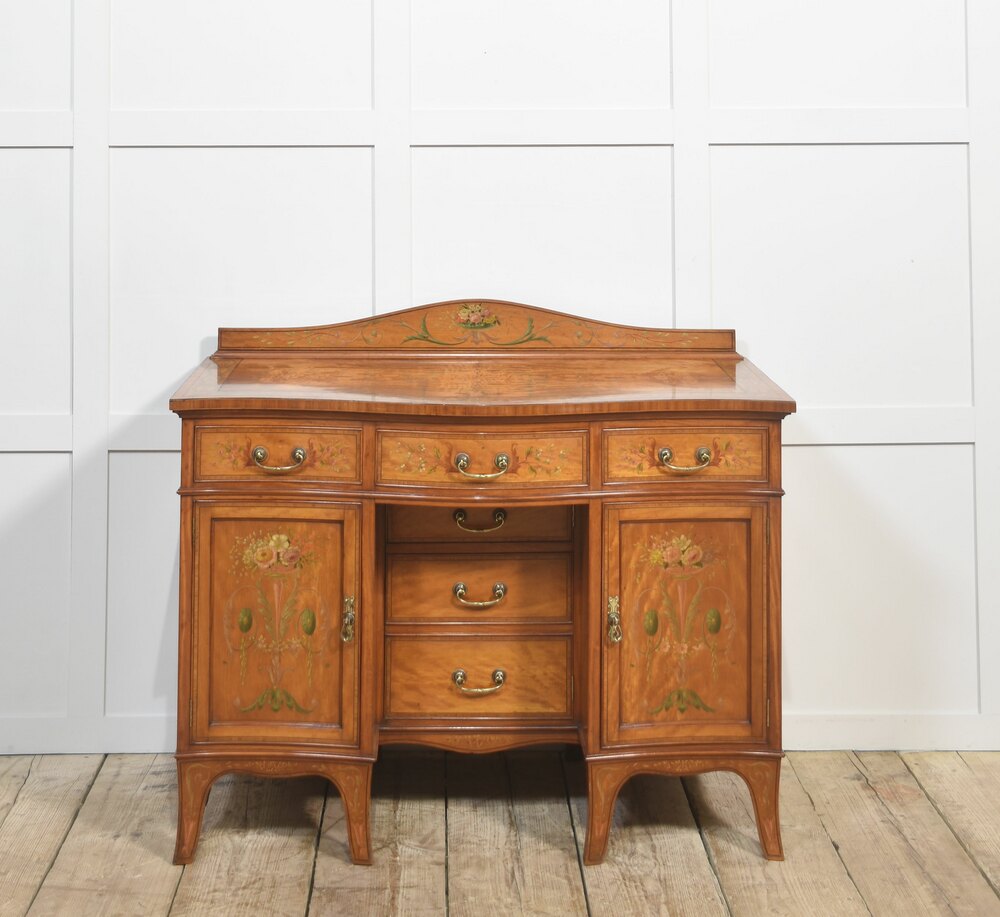 A refined late 19th to early 20th century satinwood dressing table, beautifully hand-painted in the Sheraton Revival style. The serpentine top is bordered with delicate floral garlands, while the drawers and cupboard doors are adorned with finely painted urn and floral sprays. The central section, styled as a bank of drawers, opens to reveal a concealed cupboard, offering discreet storage. Retaining its original brass handles and escutcheons, the piece stands on elegant shaped legs and features a decorative backboard with floral detail. A graceful and versatile piece that would bring period charm to a bedroom or dressing room.