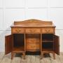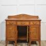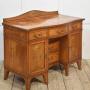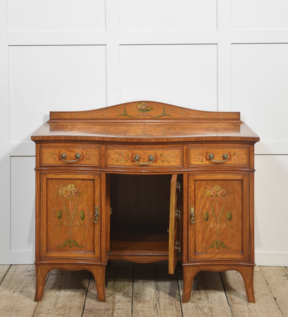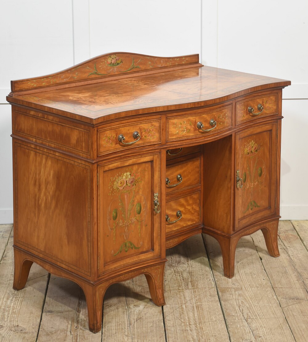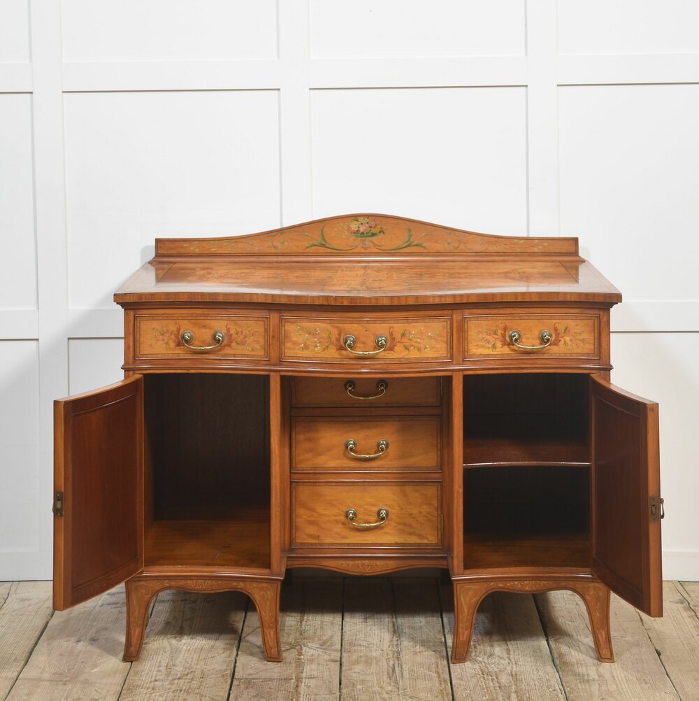 A refined late 19th to early 20th century satinwood dressing table, beautifully hand-painted in the Sheraton Revival style. The serpentine top is bordered with delicate floral garlands, while the drawers and cupboard doors are adorned with finely painted urn and floral sprays. The central section, styled as a bank of drawers, opens to reveal a concealed cupboard, offering discreet storage. Retaining its original brass handles and escutcheons, the piece stands on elegant shaped legs and features a decorative backboard with floral detail. A graceful and versatile piece that would bring period charm to a bedroom or dressing room.