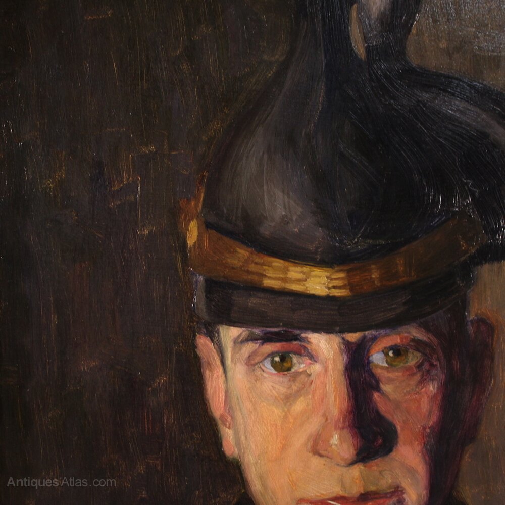 Antique Hungarian painting dated 1915. Oil on cardboard artwork depicting a portrait of a World War I soldier in uniform, of excellent pictorial quality. The painting is of beautiful size and proportion, adorned with a carved and gilded wood and plaster frame (bronze tint). The painting is signed lower left Vass E. (see photo), attributable to the Hungarian painter Elemer Vass (1887-1957), but lacks an authentication. Painting of great character, for antique dealers, interior decorators, and collectors of military portraits. The cardboard visible in the photo on the back of the painting was added over time to secure the work in the frame. The painting is in good condition. Internal dimensions: H 48.5 x W 39.5 cm.