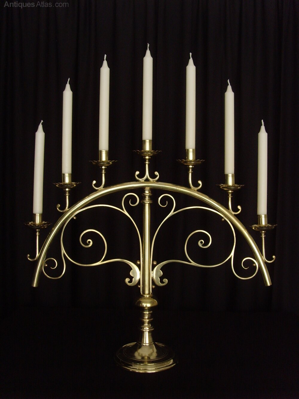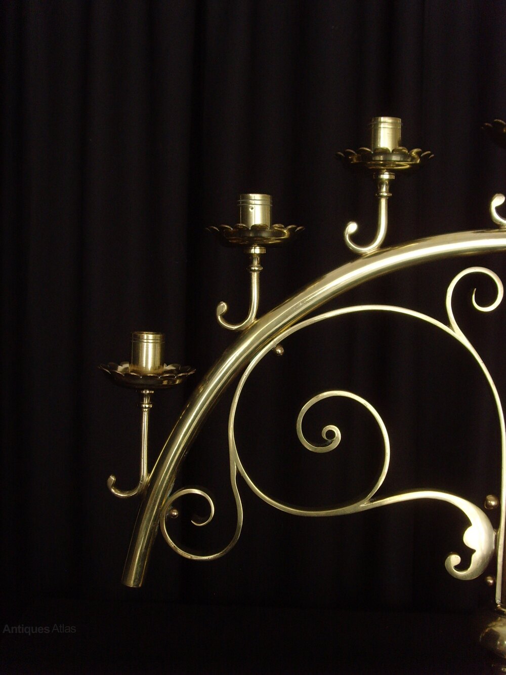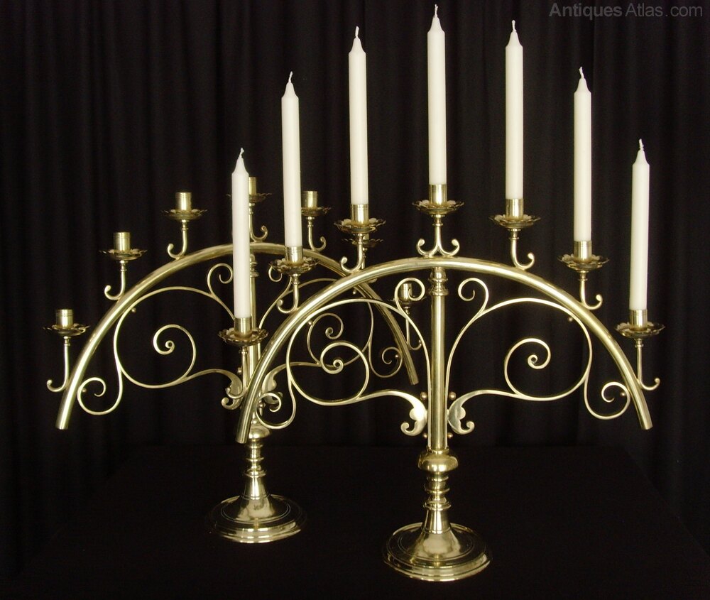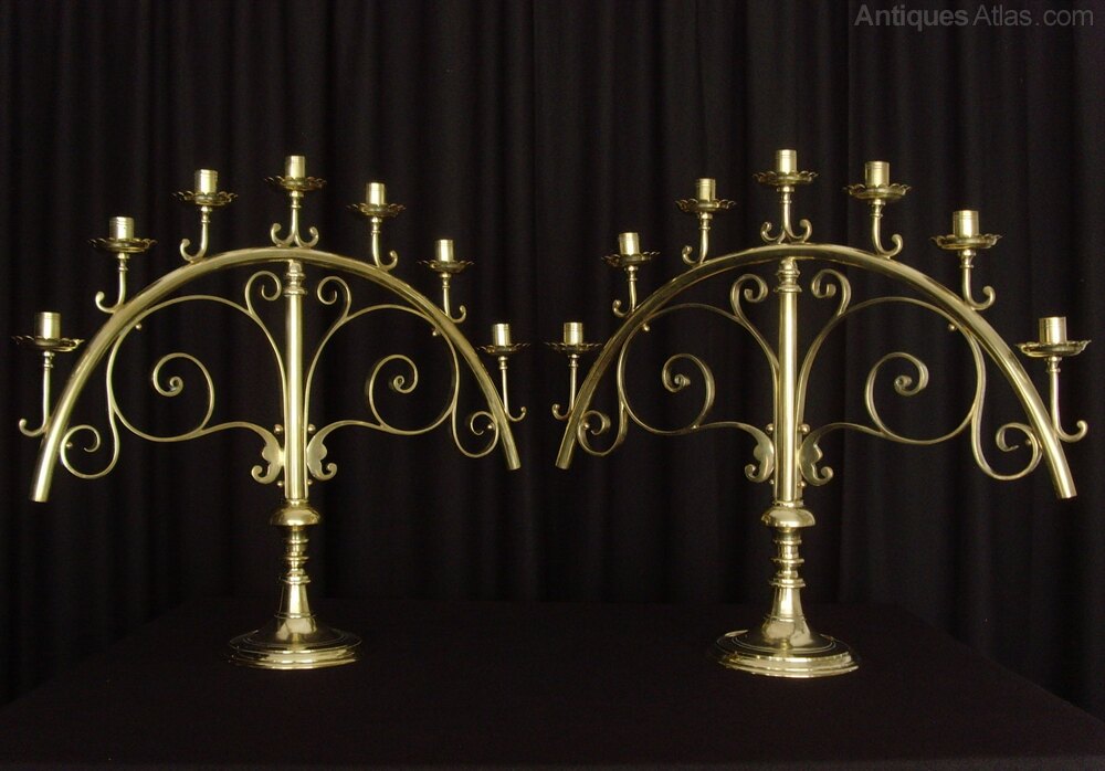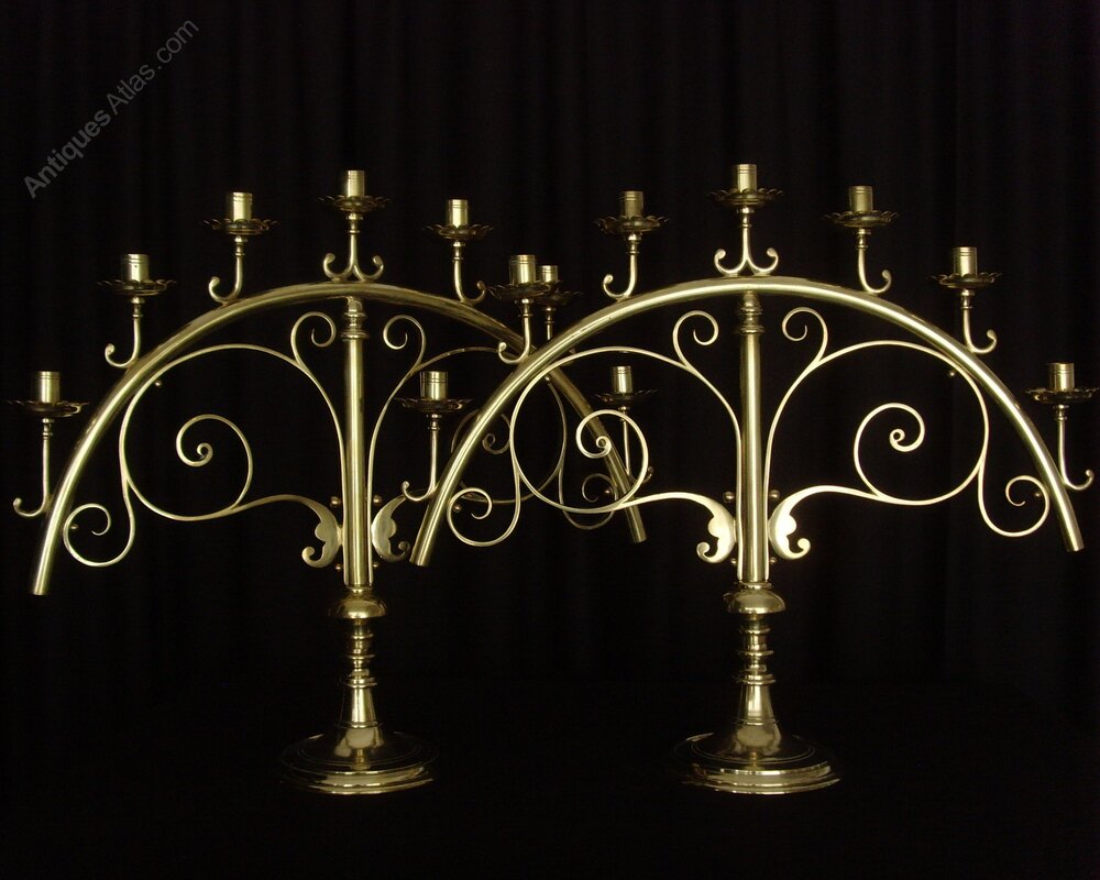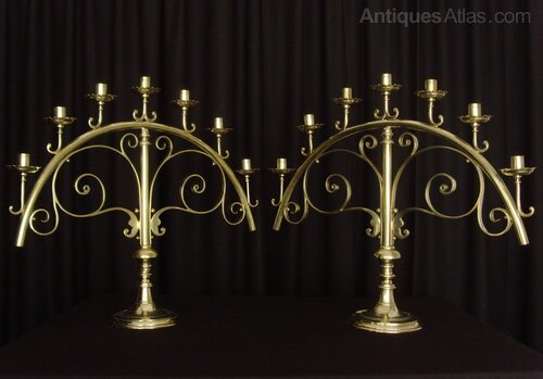 We are pleased to offer for sale this pair of arched brass 7 Light Church Benediction Candelabra, which were the property of a convent in Ireland. They each have a heavy, stepped circular base, above which are several knops, then a larger one from which emanates a tubular column which leads to the centre of the tubular arch. The arch is ornamented underneath with curlicues. The seven sconces have a half moon shaped edge to the drip pan, and both unscrew for ease of cleaning.