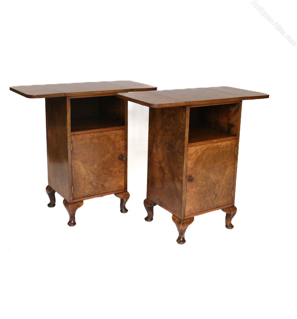 Pair Queen Anne Style Burr Walnut Drop Leaf Bedside Cupboards